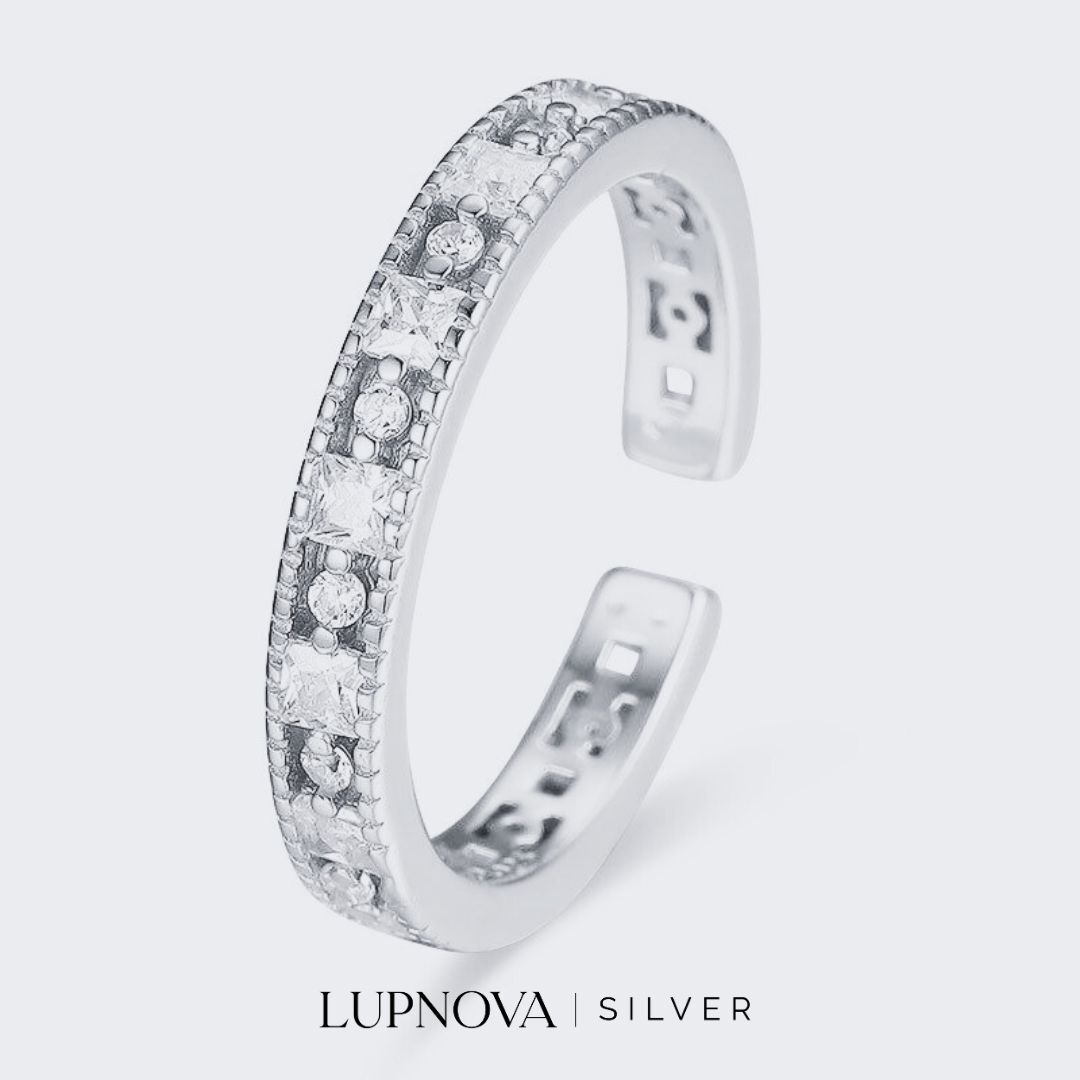 Anillo con inserción de cubos y círculos en circonia cúbica. El anillo es abierto ajustable a tallas 6, 7 y 8. Material plata925
