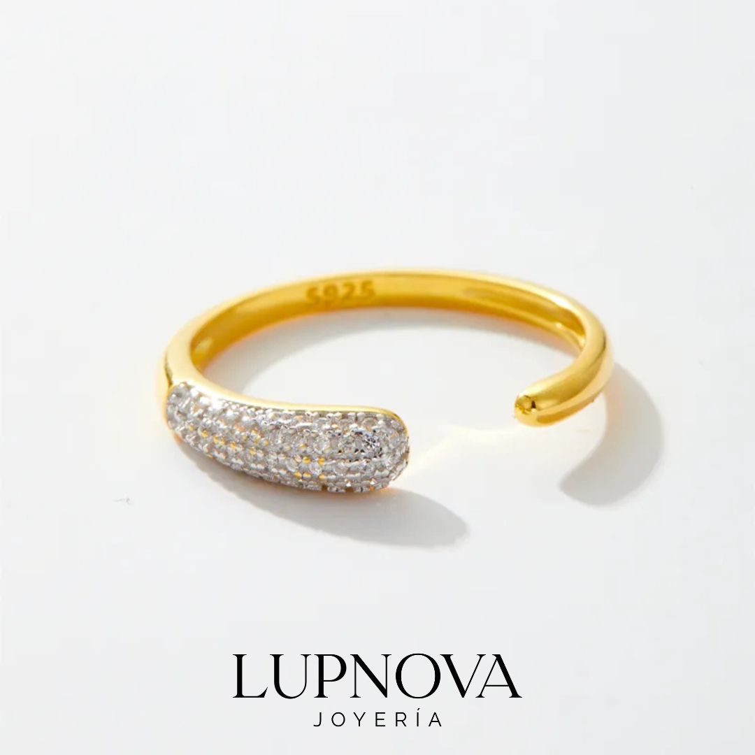 Anillo abierto en plata 925 con baño de oro 18k y delicadas incrustaciones de circonia. Una joya moderna y elegante que aporta brillo y sofisticación a tu estilo diario. Ideal para combinar con otros accesorios. El anillo es abierto ajustable a tallas 6, 7 y 8.