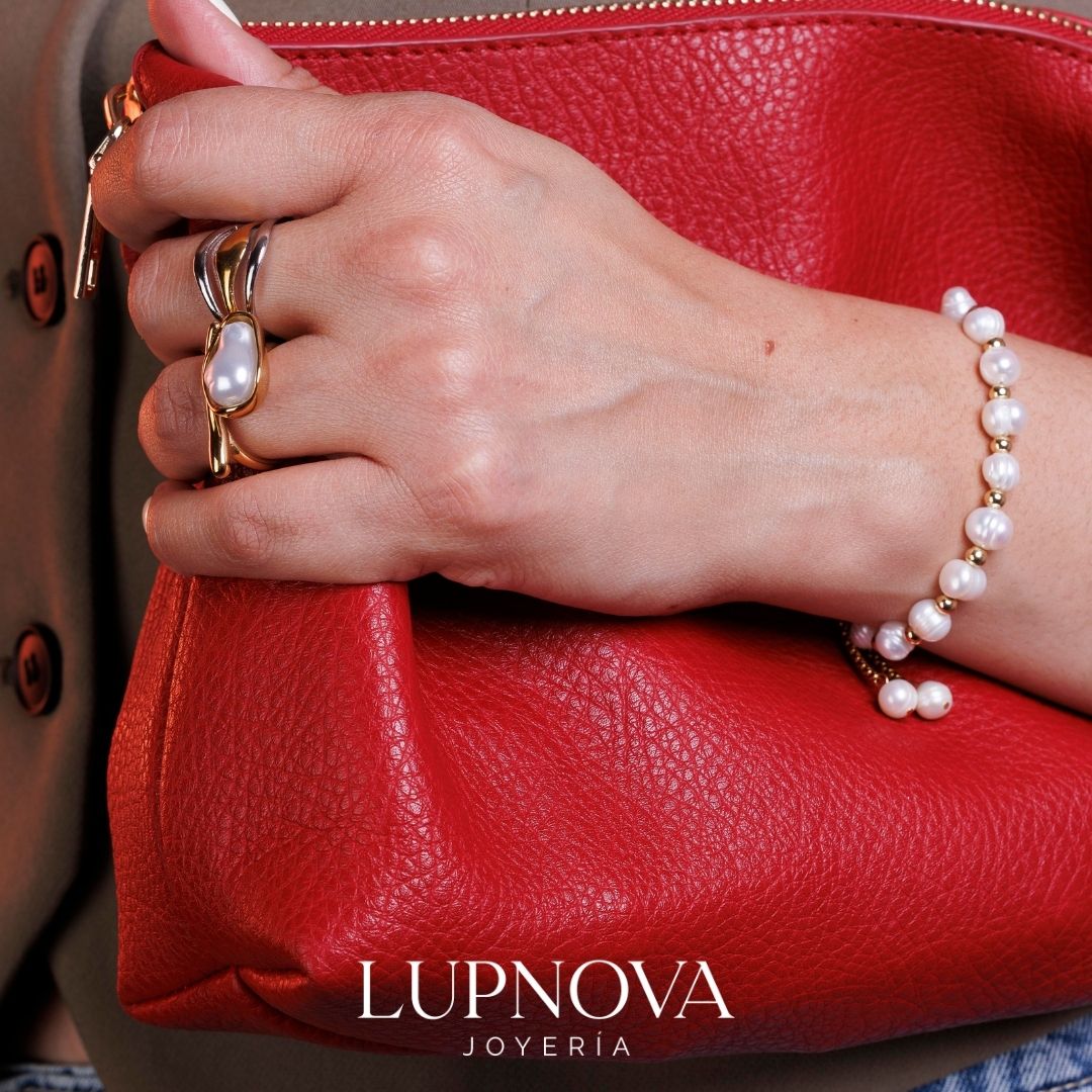 Anillo abierto de acero inoxidable con diseño ondulado en tonos dorado y plateado. Su forma fluida y moderna lo convierte en una pieza única, ideal para realzar cualquier look. El anillo es ajustable a tallas 6, 7 y 8. Encuéntralo en Lupnova.com.