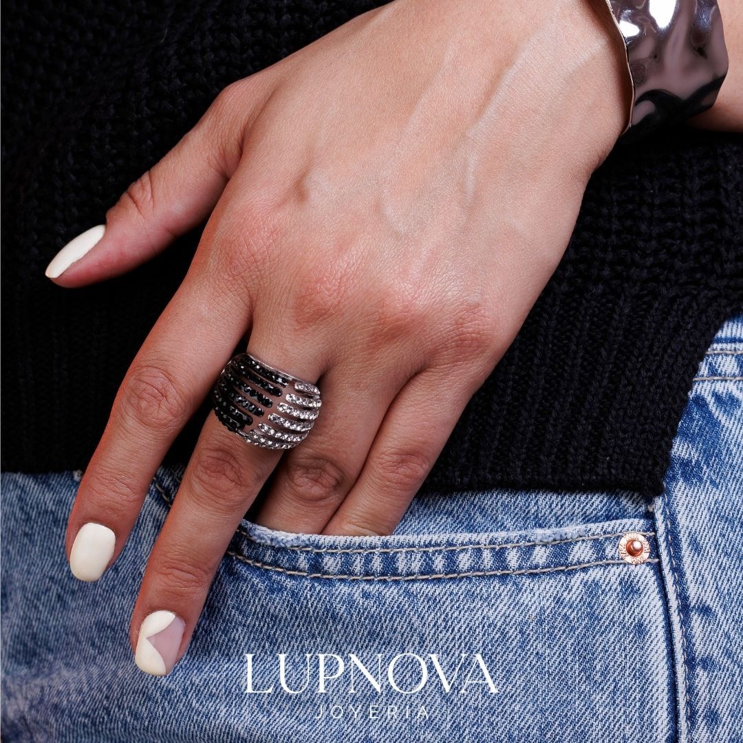 Anillo tipo statement de acero inoxidable con diseño abierto y líneas envolventes, decorado con pavé de cristales en blanco y negro para un efecto bicolor súper elegante. Su estilo moderno y llamativo lo convierte en el anillo ideal para mujer que busca un toque sofisticado y fácil de combinar, perfecto para elevar cualquier look de día o de noche. El anilo no es ajustable.