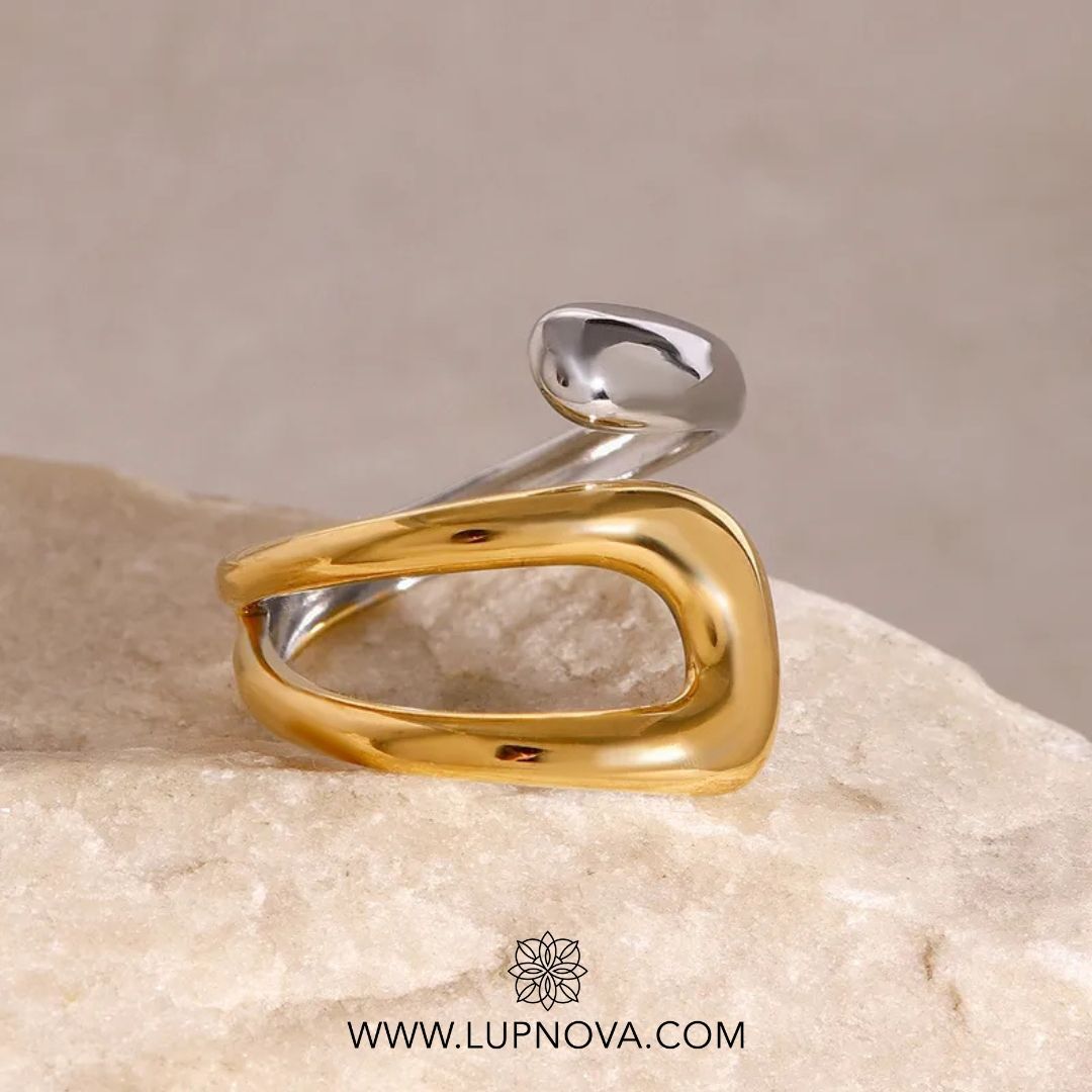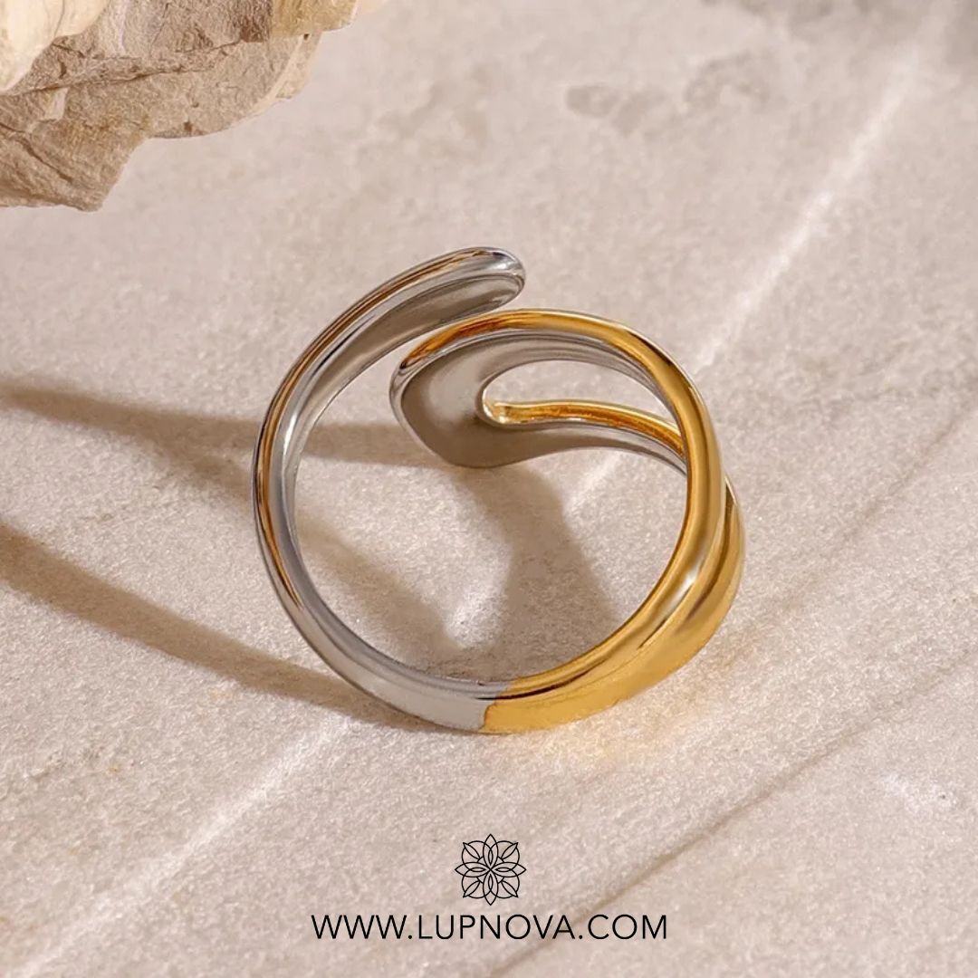 Anillo de acero inoxidable en un elegante acabado de dos tonos que fusiona delicadamente tonos dorados y plateados. Su diseño moderno y curvilíneo simboliza armonía y equilibrio, ideal tanto para uso diario como para ocasiones especiales. Duradero, hipoalergénico y con un toque sofisticado. El anillo es ajustable a tallas 6, 7 y 8. Material acero inoxidable.