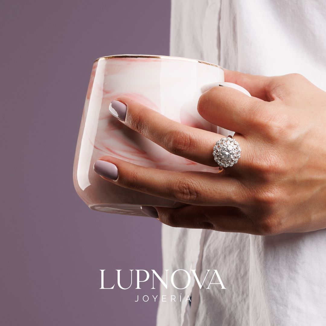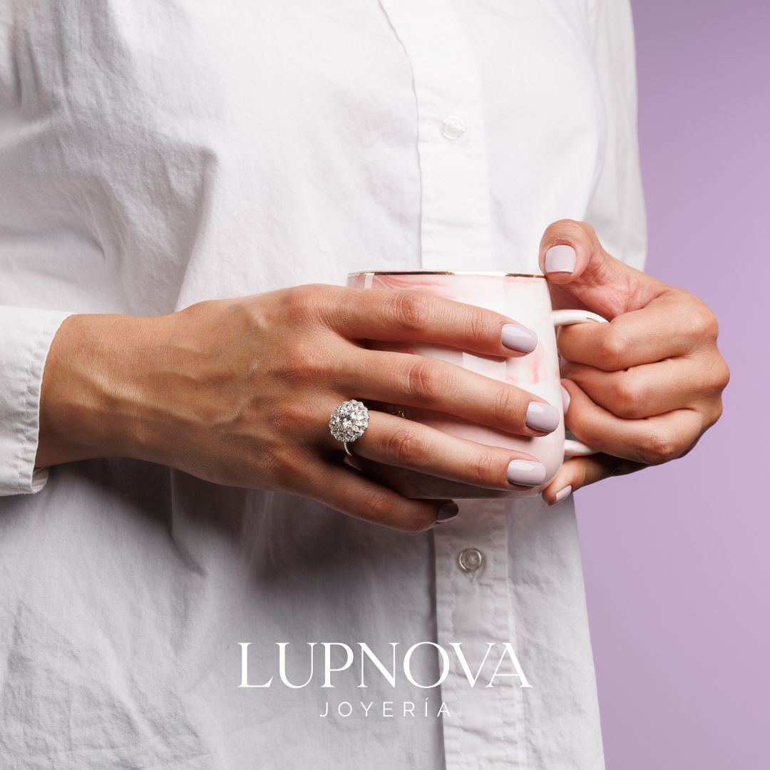 Anillo diseño de halo floral con inserción de circonia cúbica moissanita redondo, rodeada por un doble halo de piedras brillantes en forma de pétalos. Ideal para compromisos, aniversarios o para añadir un toque de lujo a cualquier look. La piedra principal de 2 quilates. Material plata925 con proceso de galvanoplastia en rodio. El anillo es ajustable a tallas 6, 7 u 8.