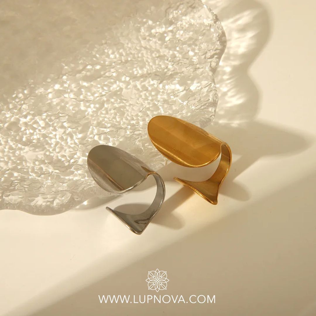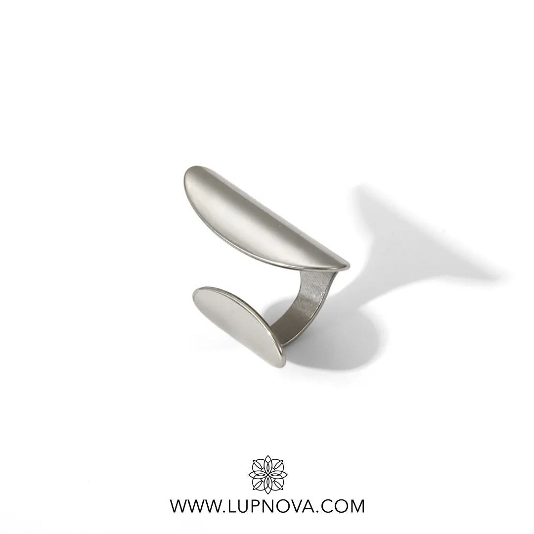Anillo con forma geométrica de ola. El anillo es ajustable a tallas 6, 7 u 8. Material acero inoxidable.