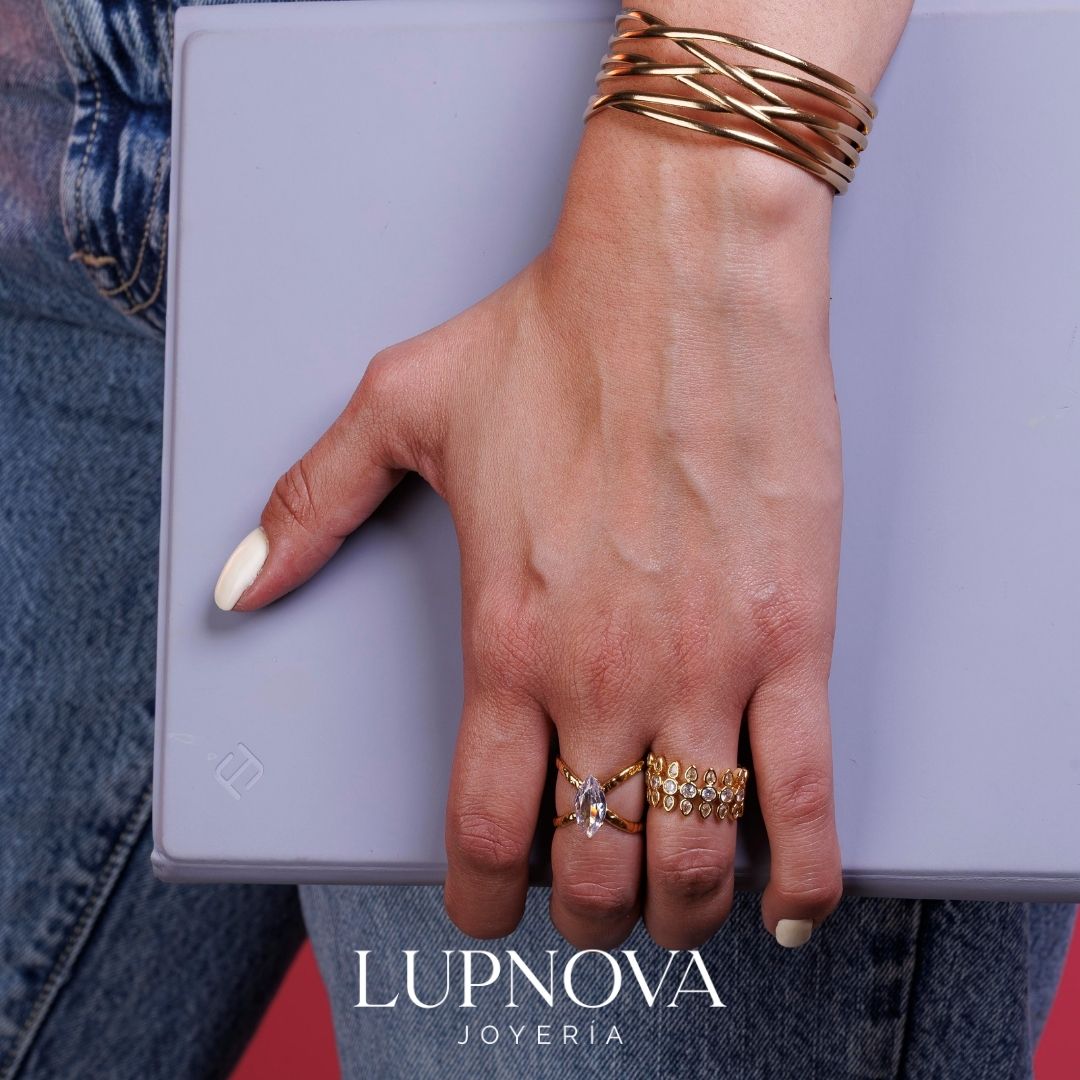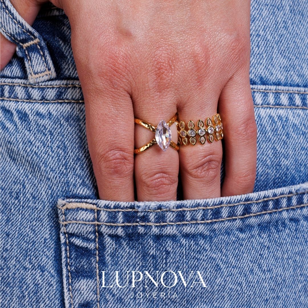 Anillo de diseño moderno con cristal central tipo marquise, elaborado en acero inoxidable con baño de oro 18K. Su estilo elegante y minimalista con líneas curvas lo convierte en el complemento ideal para elevar looks de diario o de ocasión especial. Perfecto para quienes buscan anillos dorados de acero inoxidable para mujer, resistentes, sofisticados y con acabado premium. El anillo es ajustable a tallas 6, 7 y 8. Material acero inoxidable.