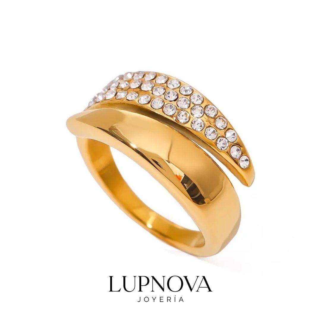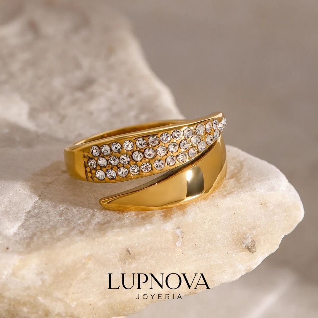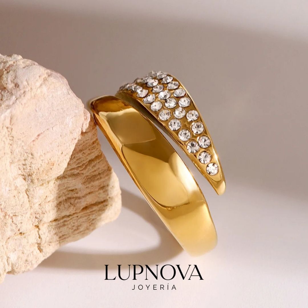 El Golden Spark es un diseño audaz y elegante, fabricado en acero inoxidable de alta calidad con un lujoso baño de oro de 18K. Su silueta curva única está adornada con cristales brillantes que reflejan la luz de forma espectacular. Perfecto para looks de noche, ocasiones especiales o para añadir un toque glamuroso a tu estilo diario. Material acero inoxidable, ajustable a tallas 6, 7 u 8.