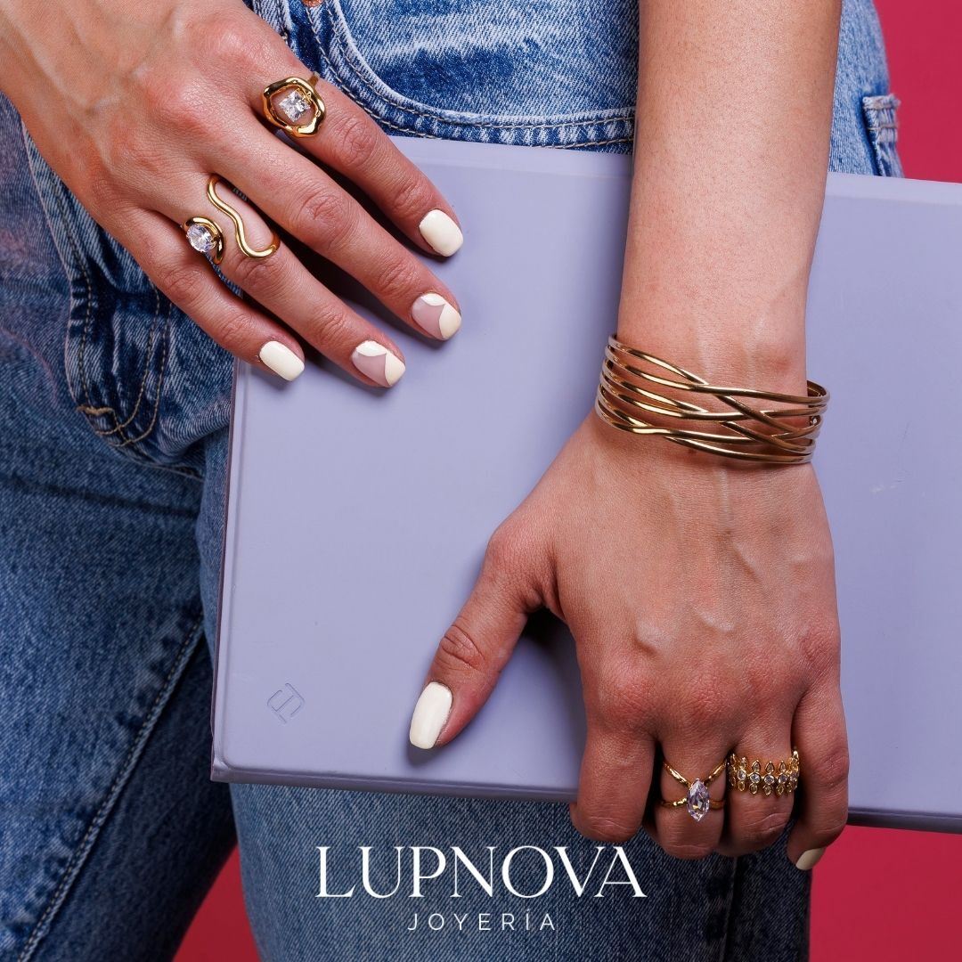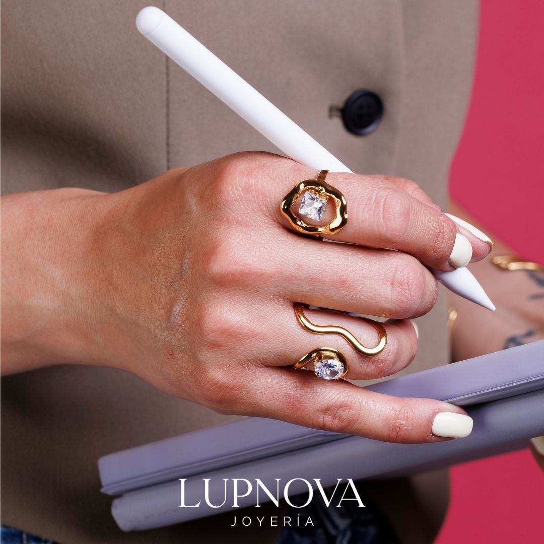 Anillo de diseño moderno con cristal central ovalado y estructura de líneas curvas, elaborado en acero inoxidable con baño de oro 18K. Su estilo elegante y contemporáneo lo convierte en una pieza ideal para elevar looks casuales o de ocasión especial. Perfecto para quienes buscan anillos dorados de acero inoxidable para mujer, resistentes, sofisticados y con brillo duradero. El anillo es abierto ajustable a tallas 6, 7 y 8. Material acero inoxidable.