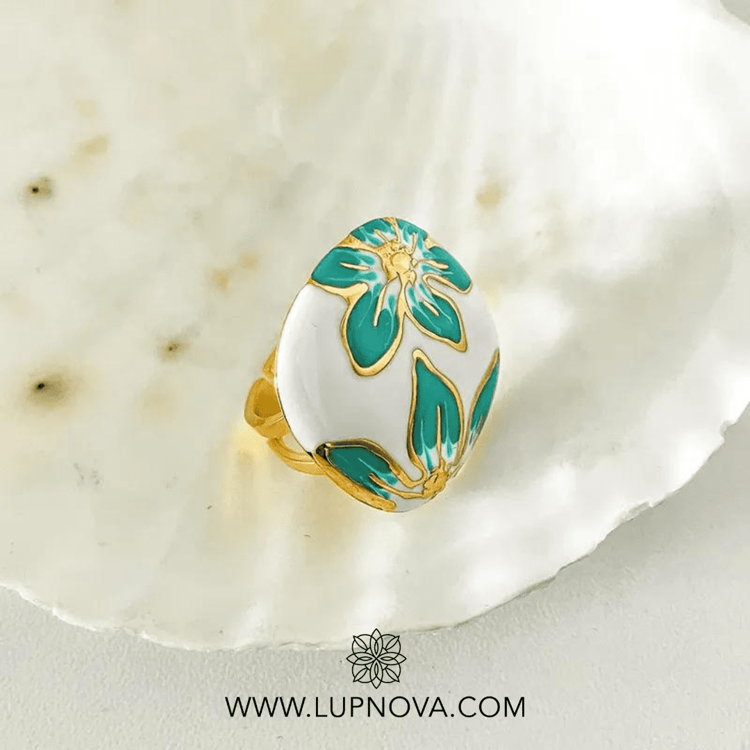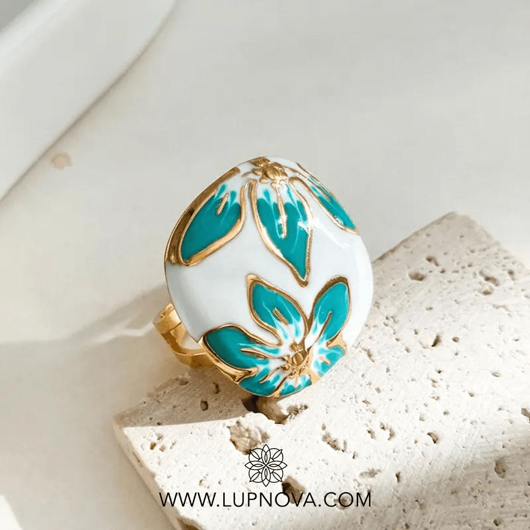 Anillo cuadrado diseño de azucena en porcelana blanca y turquesa.El anillo es abierto ajustable a tallas 6, 7 y 8. Material acero inoxidable.