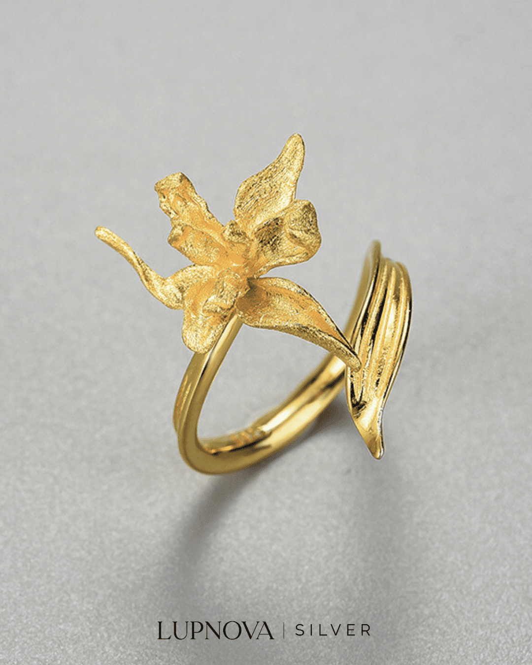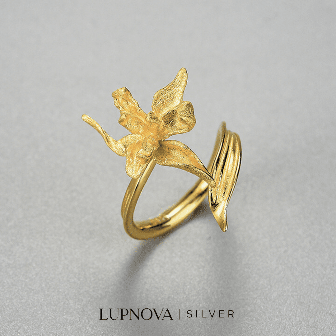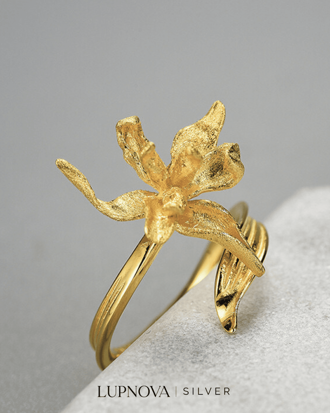 Anillo con diseño de orquídea, anillo abierto ajustable a talla 6, 7 u 8. Material plata925.
