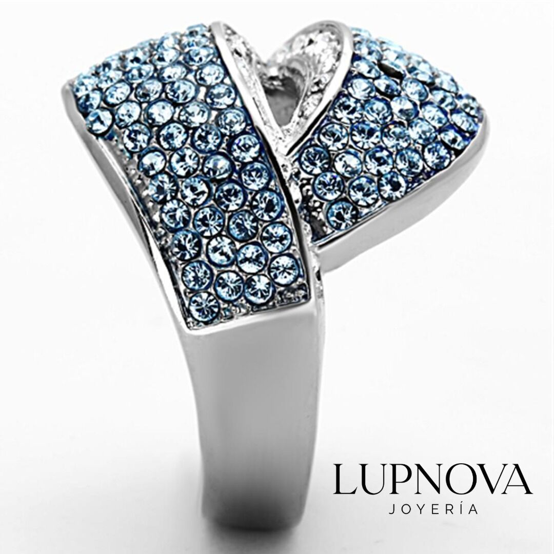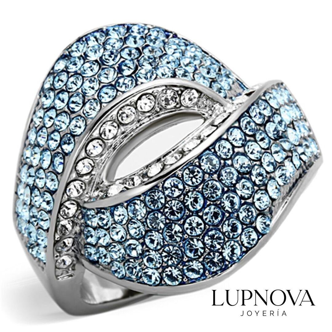 Anillo tipo statement de acero inoxidable con diseño cruzado y acabado pulido, decorado con un pavé de cristales en tonos azul celeste y azul profundo para un brillo llamativo. Ideal para elevar tus looks de día o de noche, este anillo elegante para mujer combina estilo moderno y presencia, perfecto para regalar o para usar como pieza protagonista.