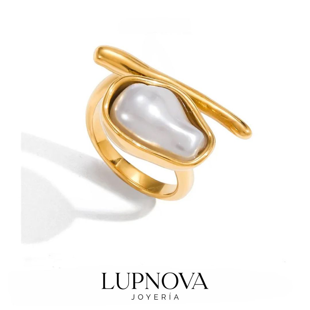 Anillo de diseño escultural con perla sintética de forma orgánica, elaborado en acero inoxidable con baño de oro 18K. Su silueta moderna de líneas fluidas y acabado brillante crea un estilo elegante y sofisticado, ideal para elevar looks de diario o de ocasión especial. Perfecto para quienes buscan anillos dorados de acero inoxidable para mujer con perla, resistentes, llamativos y con acabado premium. El anillo es abierto ajustable a tallas 6, 7 y 8. Material acero inoxidable.