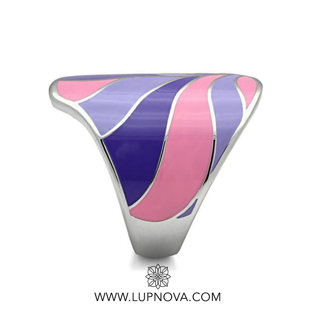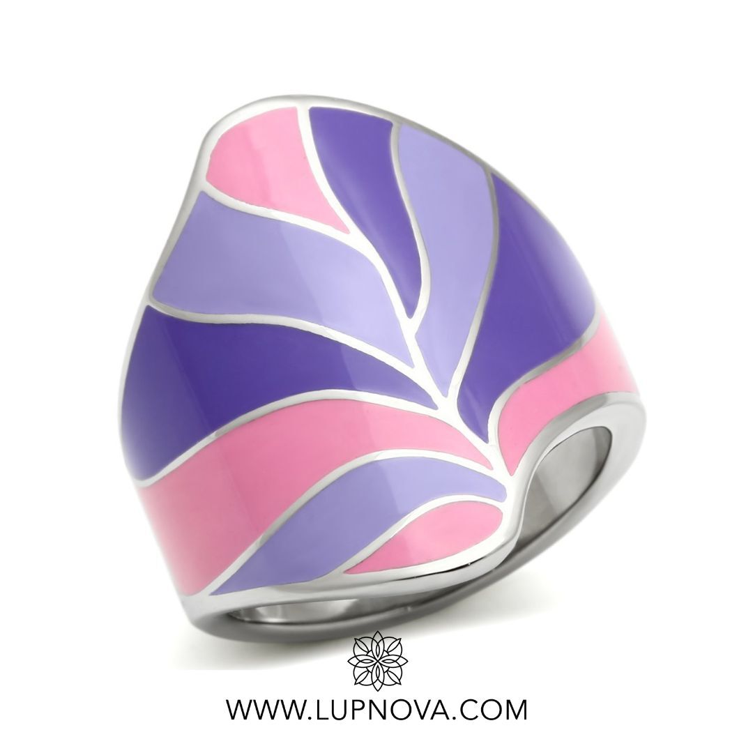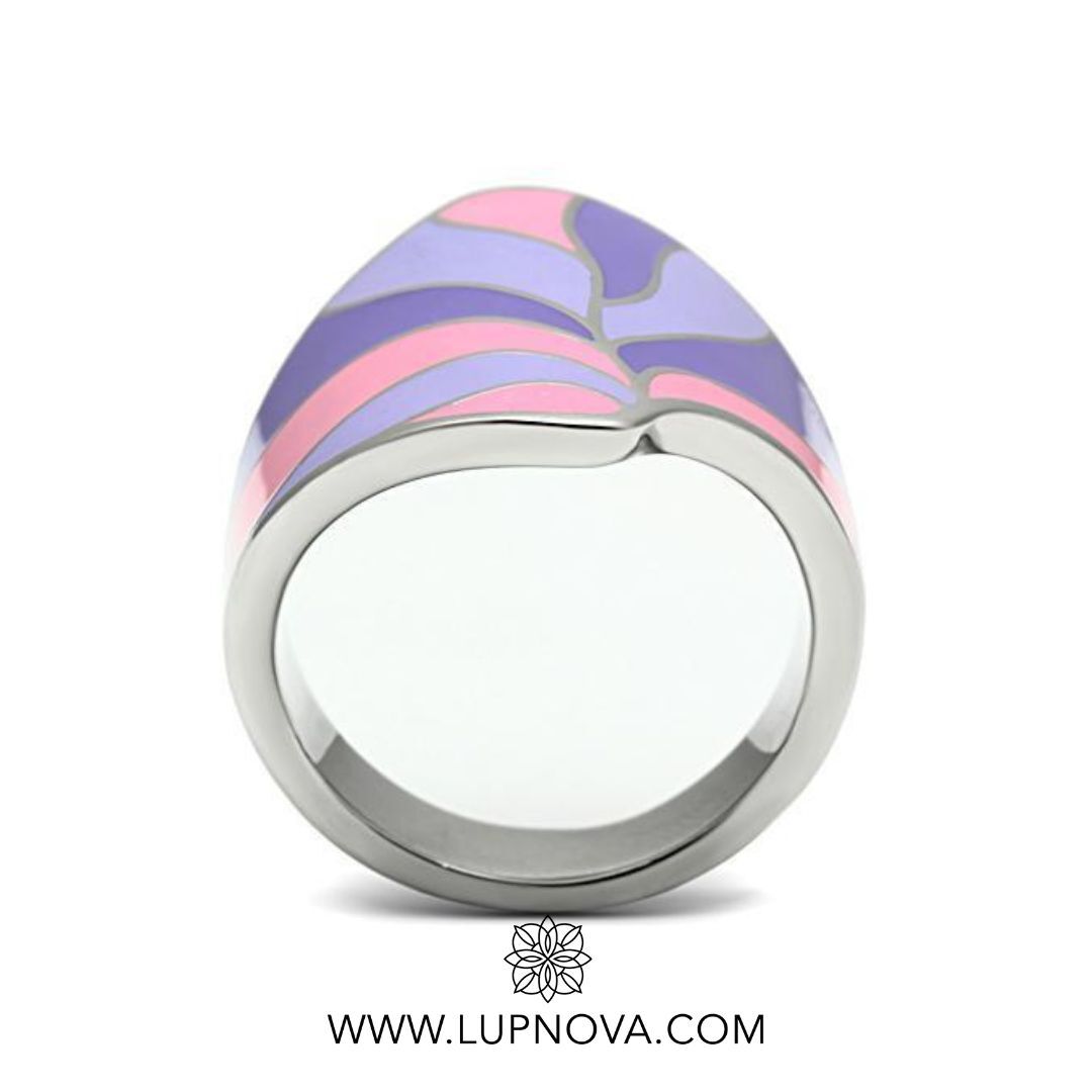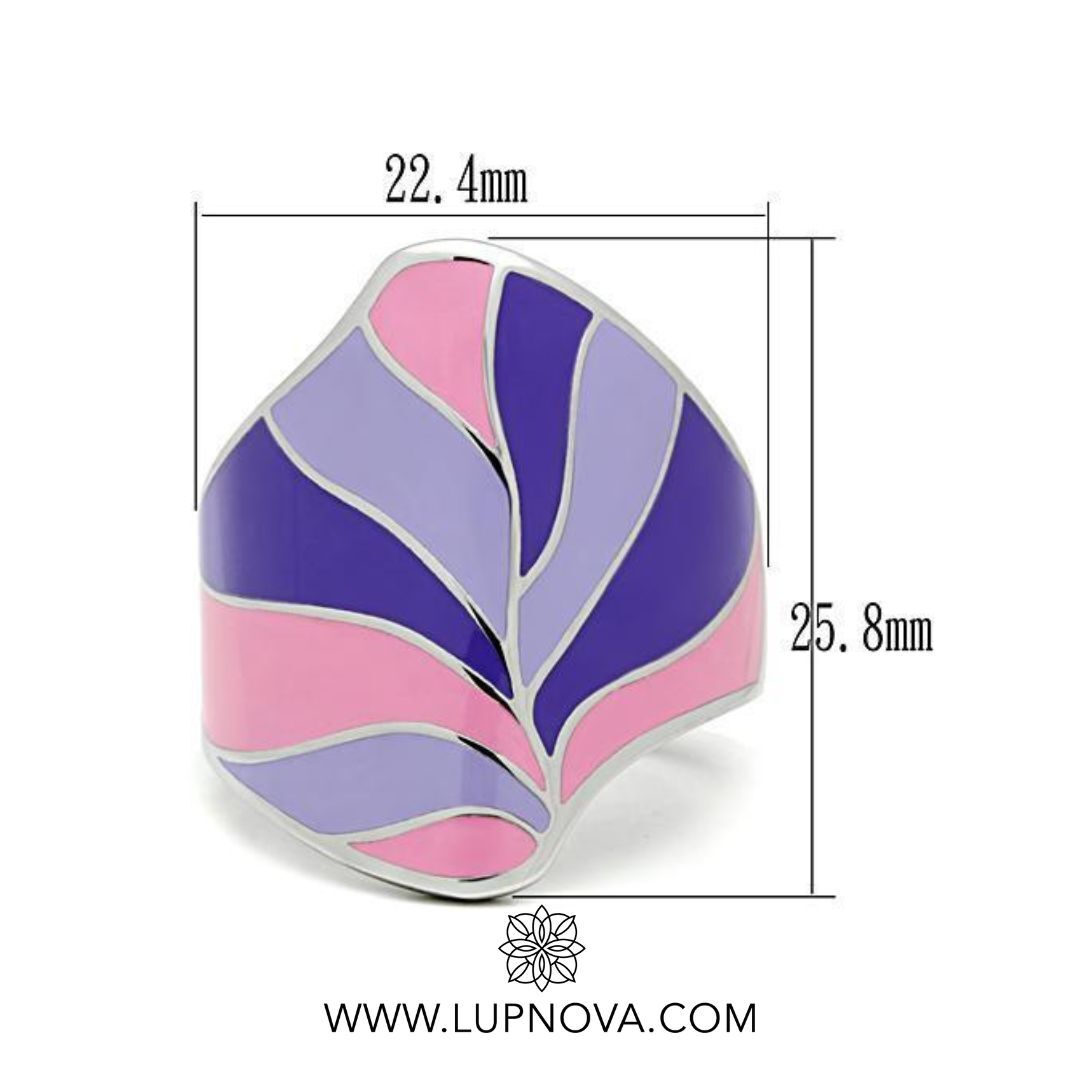 Anillo con diseño floral en tonos púrpura. Material acero inoxidable.