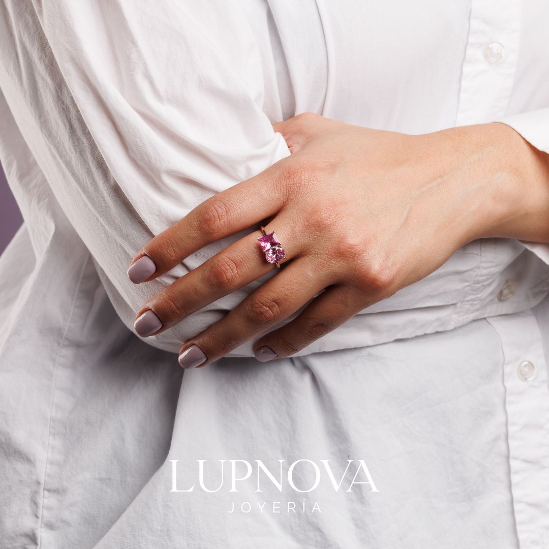 El Anillo Rose Fusion combina dos impresionantes tonos de rosa en perfecto equilibrio. Elaborado en plata925 de alta calidad, presenta una circonia corte redondo radiante junto a una circonia corte princesa de color vibrante, creando un diseño moderno y llamativo. Ideal para añadir un toque fresco y femenino a tu colección de joyas. Material plata925, el anillo es ajustable a tallas 6, 7 u 8.