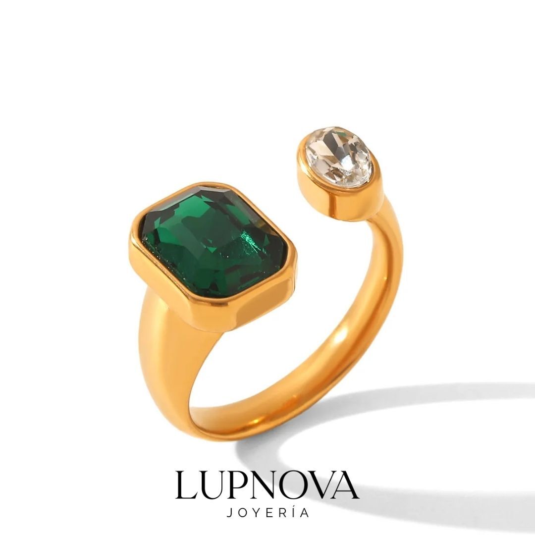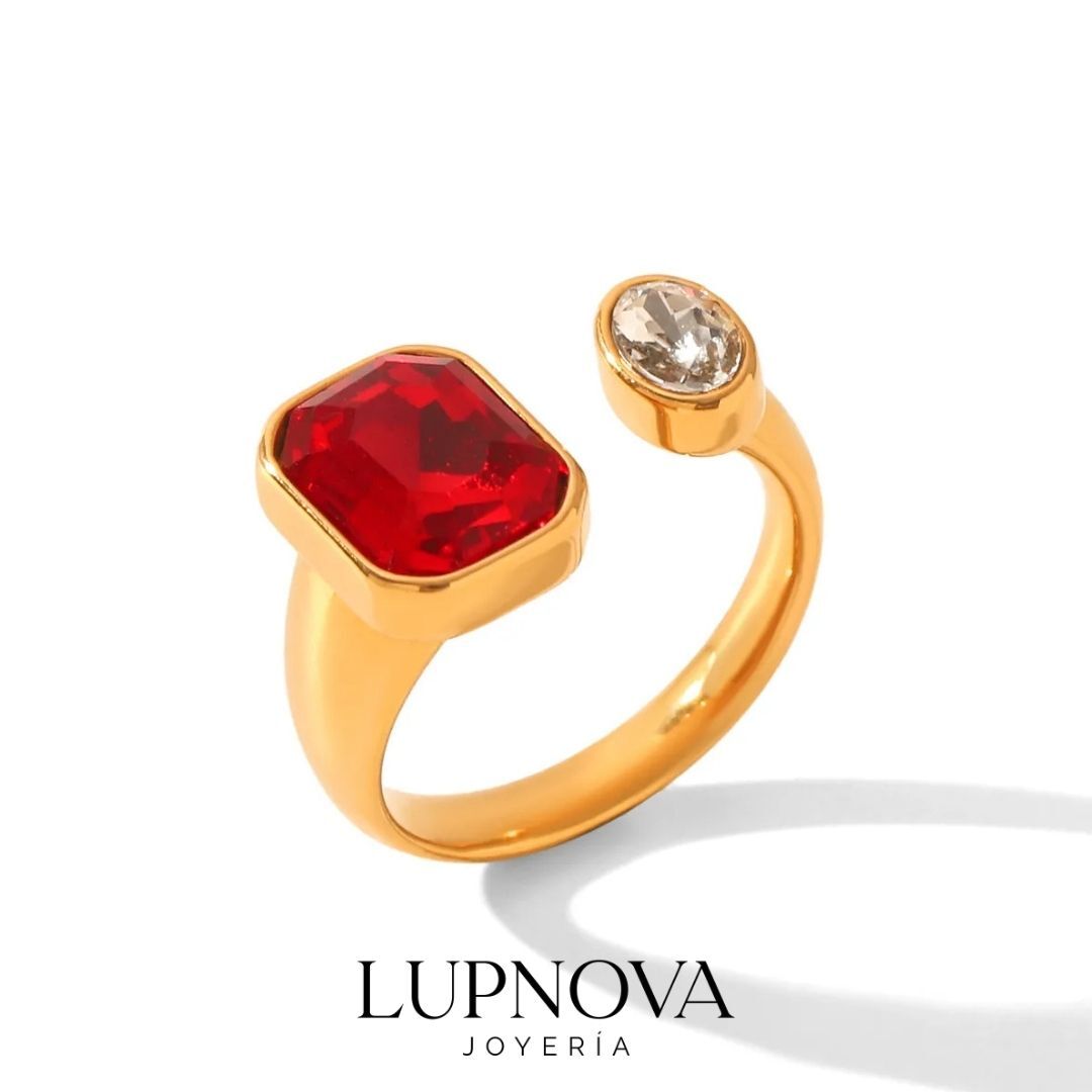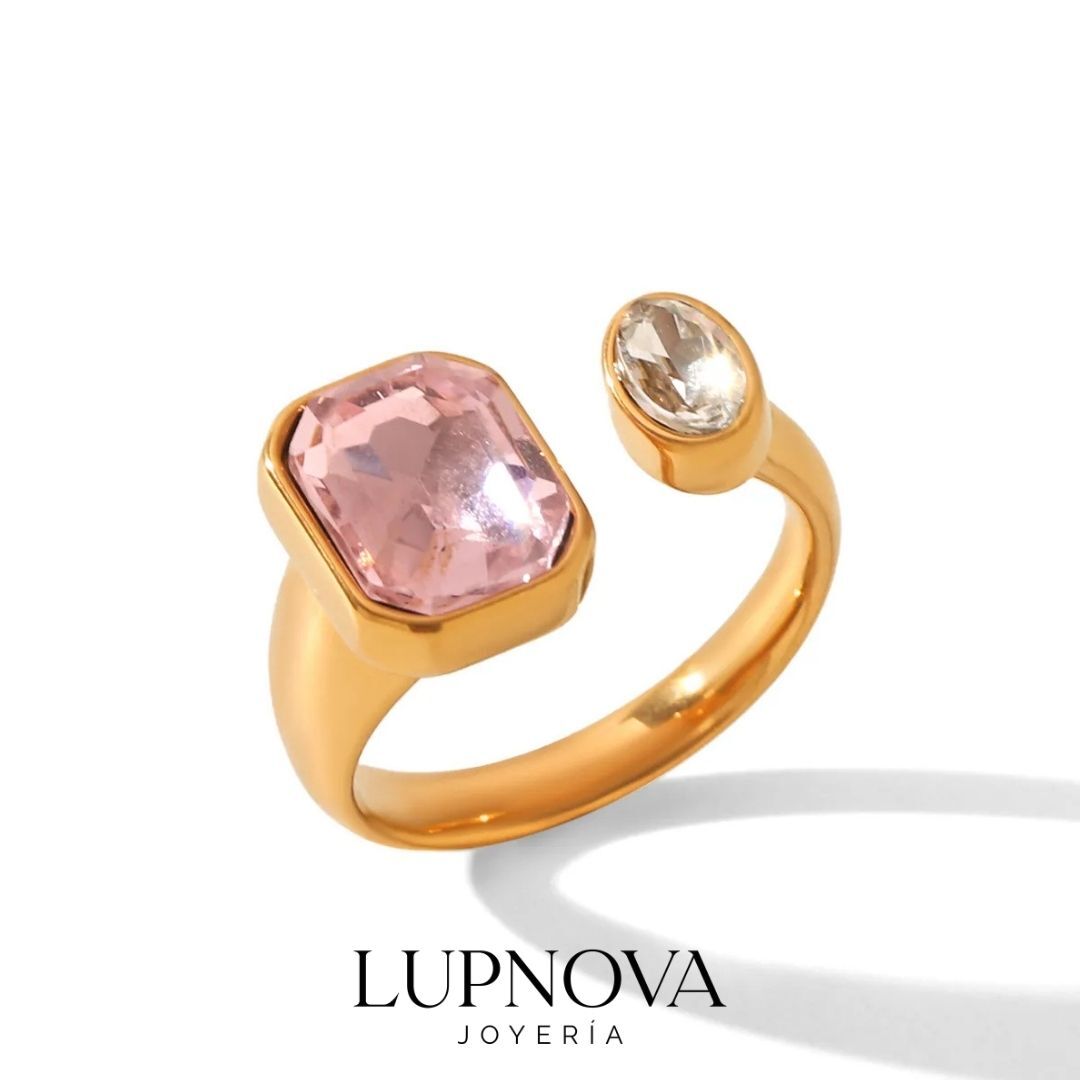 Anillo abierto ajustable en acero inoxidable con baño de oro 18k, con dos piedras de cristal: una rectangular facetada en tono rubí, esmeralda o rosa, y una oval transparente. Un diseño lujoso inspirado en la joyería de época, disponible en tres colores. Resistente al desgaste y apto para pieles sensibles. Disponible en Lupnova Joyería. El anillo es abierto ajustable a tallas 6,7 u 8.