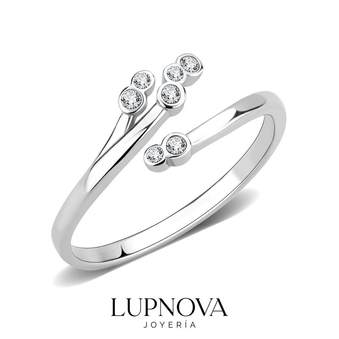 Anillo abierto de acero inoxidable con delicadas incrustaciones de zirconia cúbica AAA, diseñado para brindar un brillo elegante y moderno. Su estilo minimalista y sofisticado lo convierte en el accesorio ideal para uso diario o para elevar cualquier look con un toque fino, femenino y versátil. El anillo es abierto ajustable a tallas 6, 7 y 8.