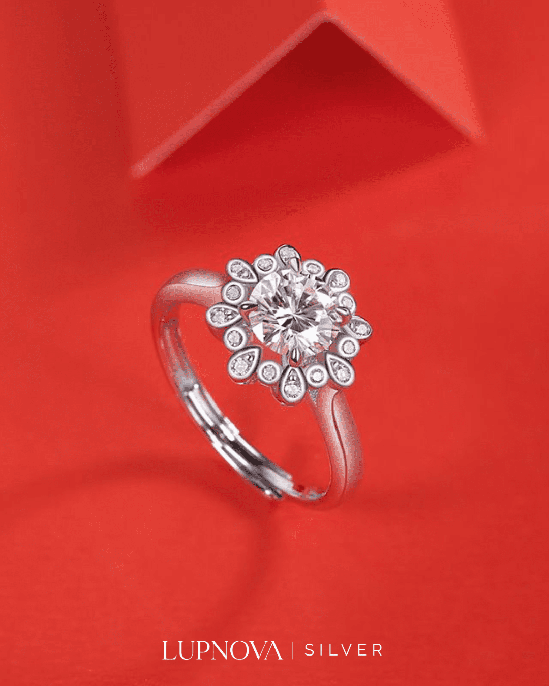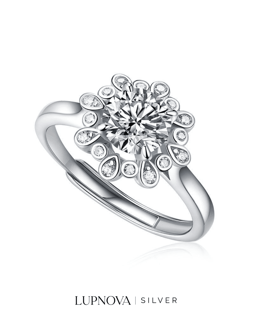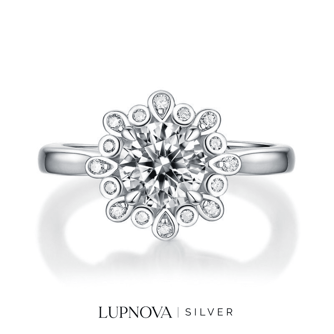 Anillo con diseño de peonia, inserción de circonia cúbica moissanita. Tamaño del top de anillo 1.25 centímetros. Piedra principal de 1 quilate. Material plata925 con proceso de galvanoplastia rodio. Anillo ajustable a tallas 5.5, 6 y 7 y 8.
