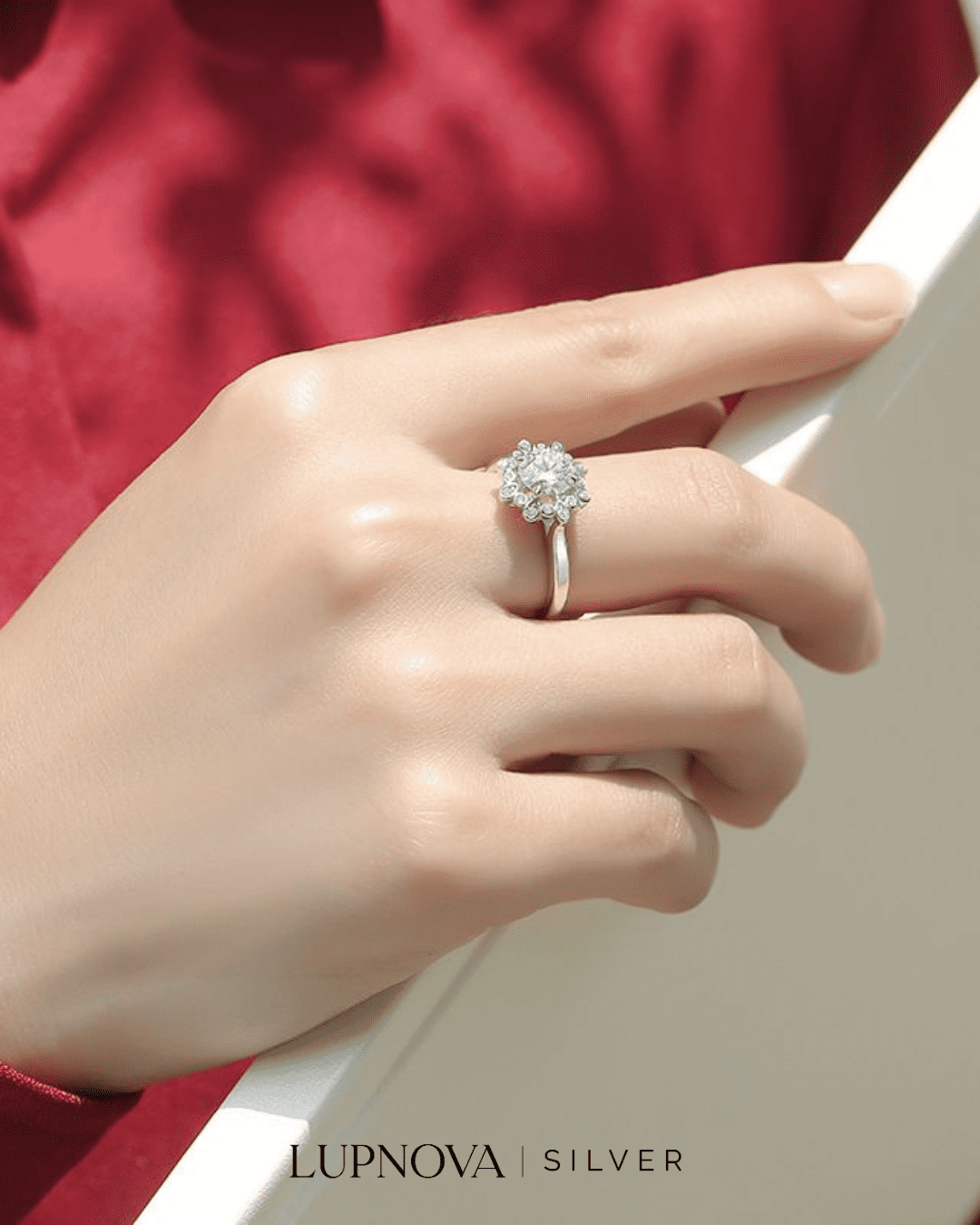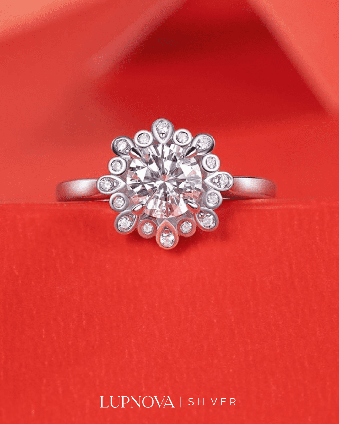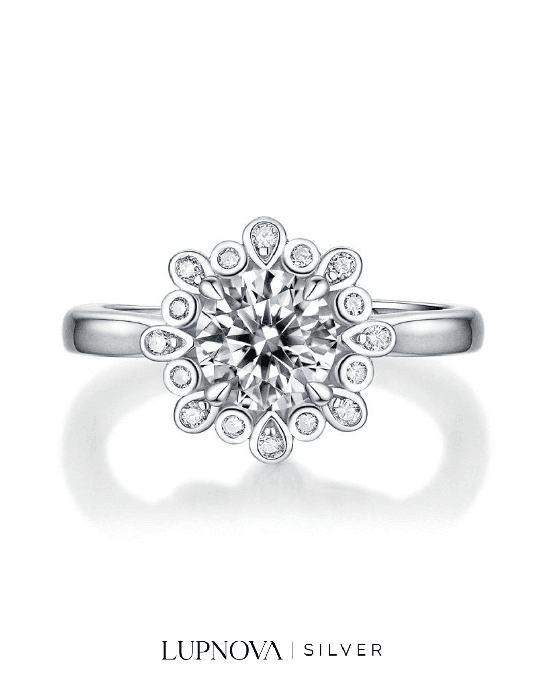 Anillo con diseño de peonia, inserción de circonia cúbica moissanita. Tamaño del top de anillo 1.25 centímetros. Piedra principal de 1 quilate. Material plata925 con proceso de galvanoplastia rodio. Anillo ajustable a tallas 5.5, 6 y 7 y 8.