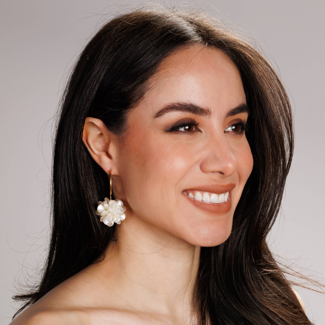 Aretes de aro en acero inoxidable con detalle de flor en acrílico blanco. Una pieza moderna y sofisticada que combina el brillo dorado con un diseño floral voluminoso, ideal para destacar en cualquier ocasión especial. Ancho de 2.8cm alto de 5.8cm, peso de 15 gramos el par.