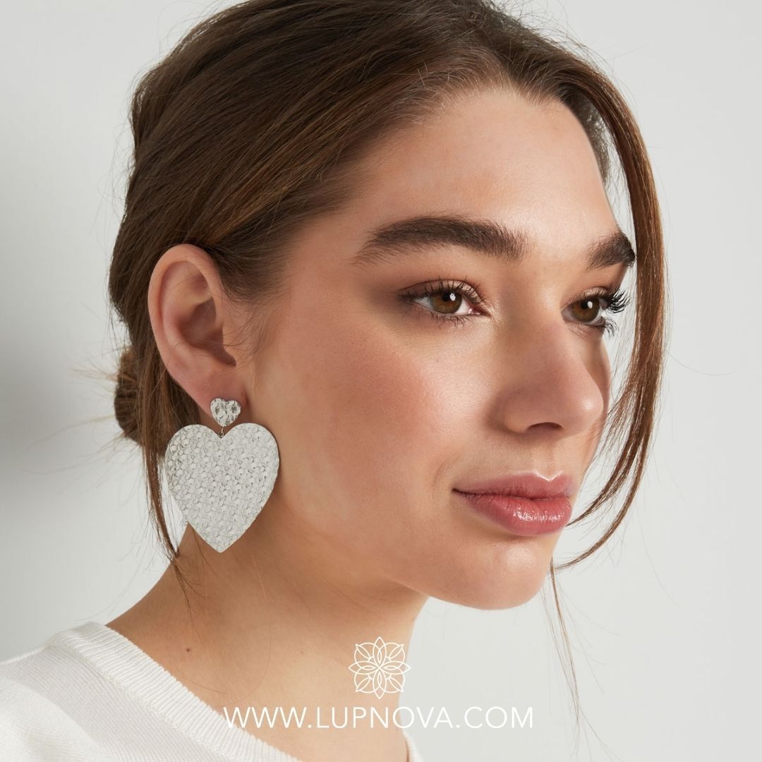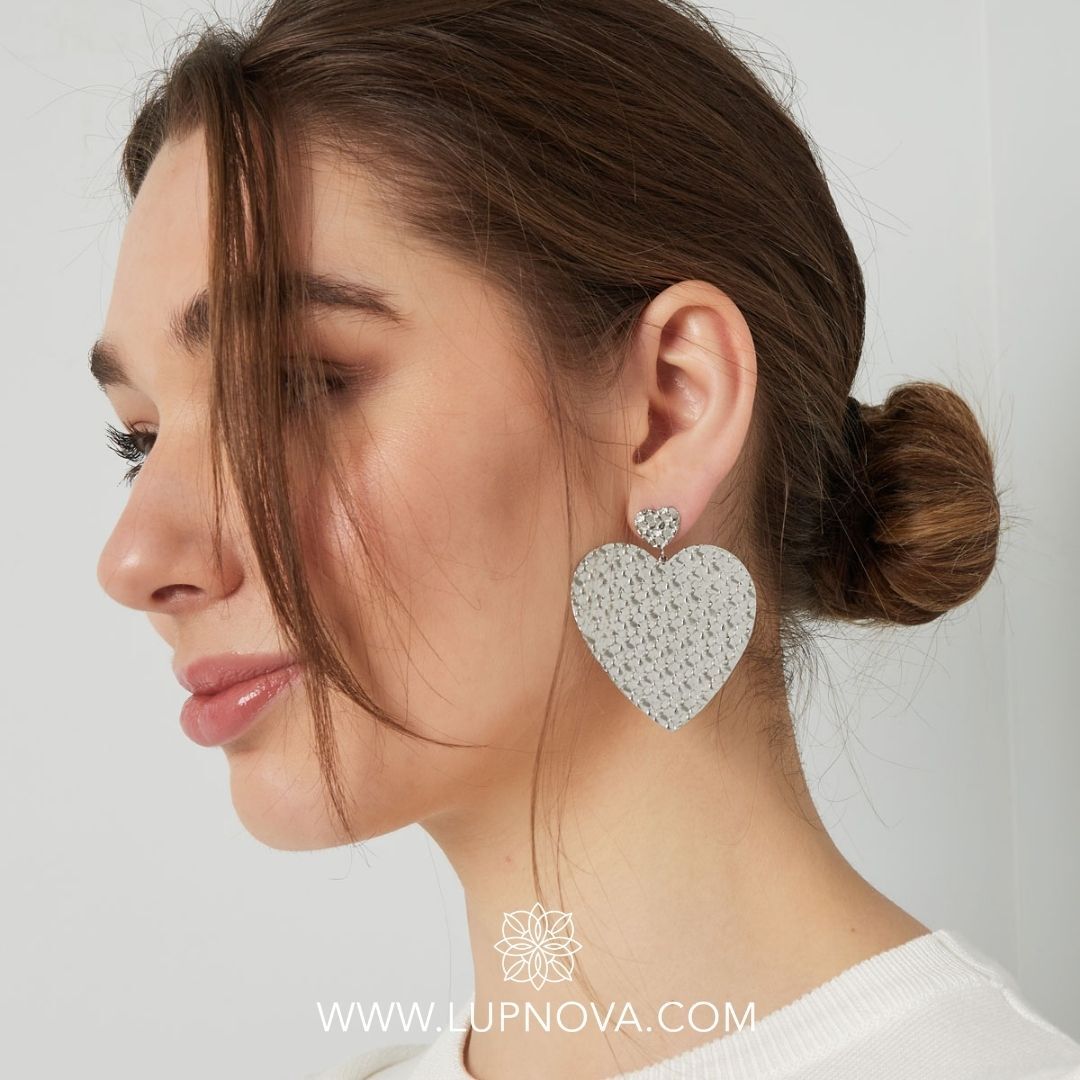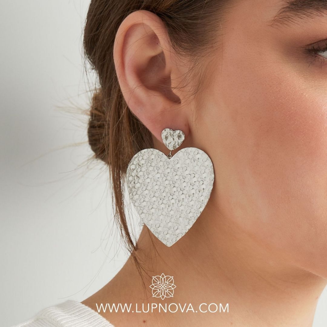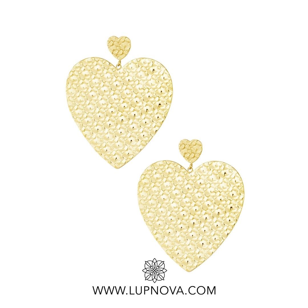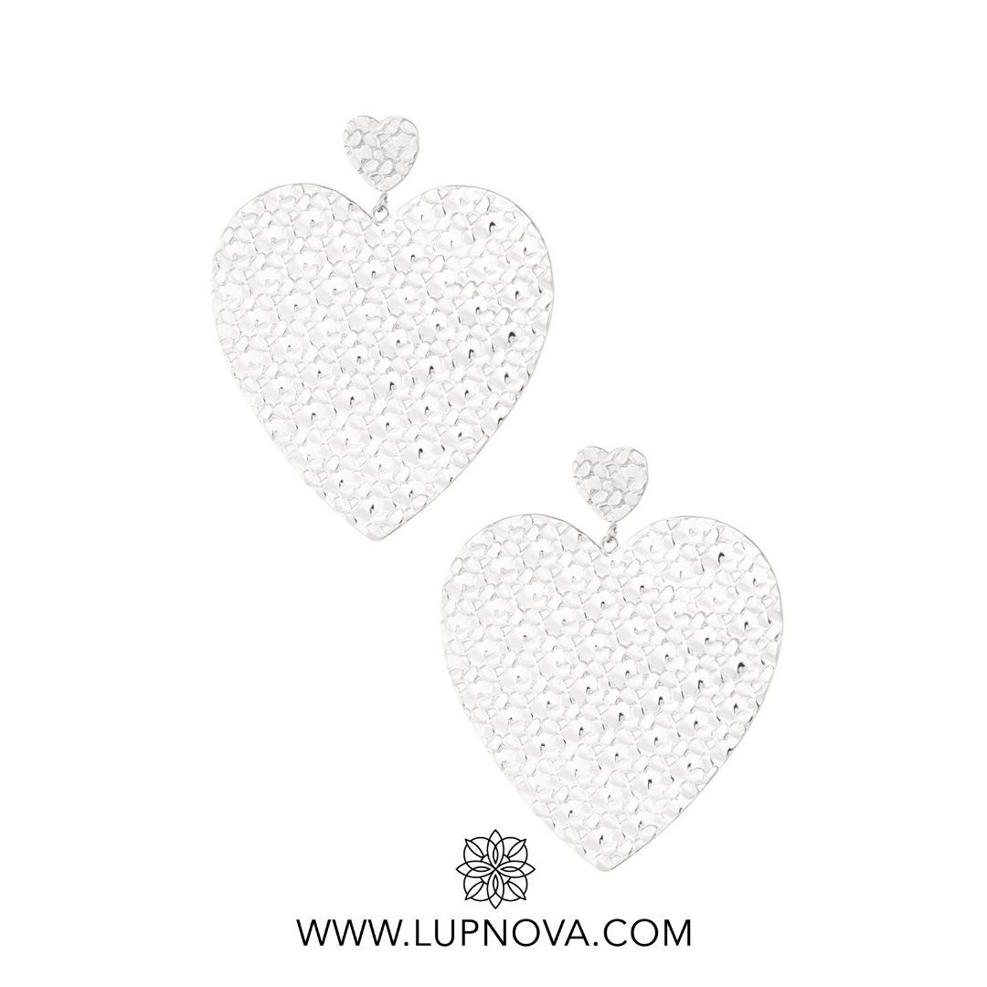 Aretes con diseño de corazón texturizado. Ancho de 5 centímetros, alto de 5.7 centímetros. Peso de 22 gramos el par. Material acero inoxidable.