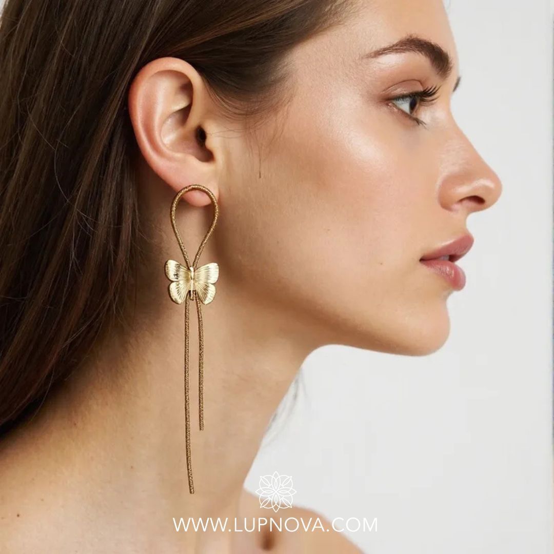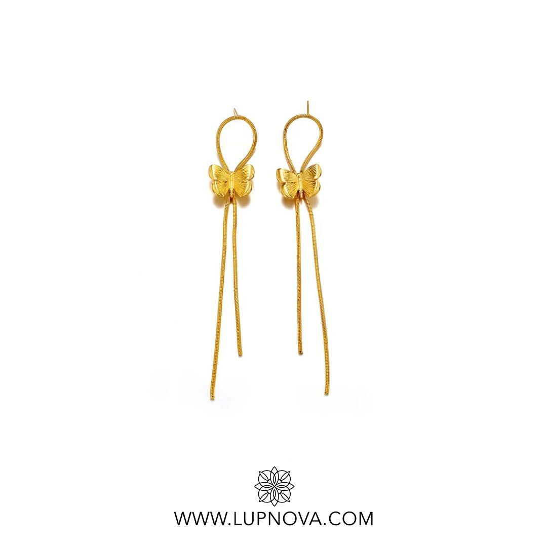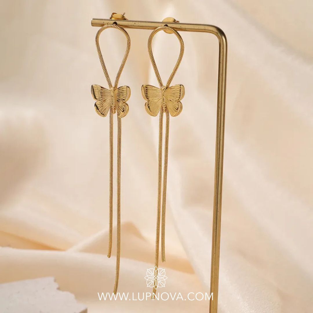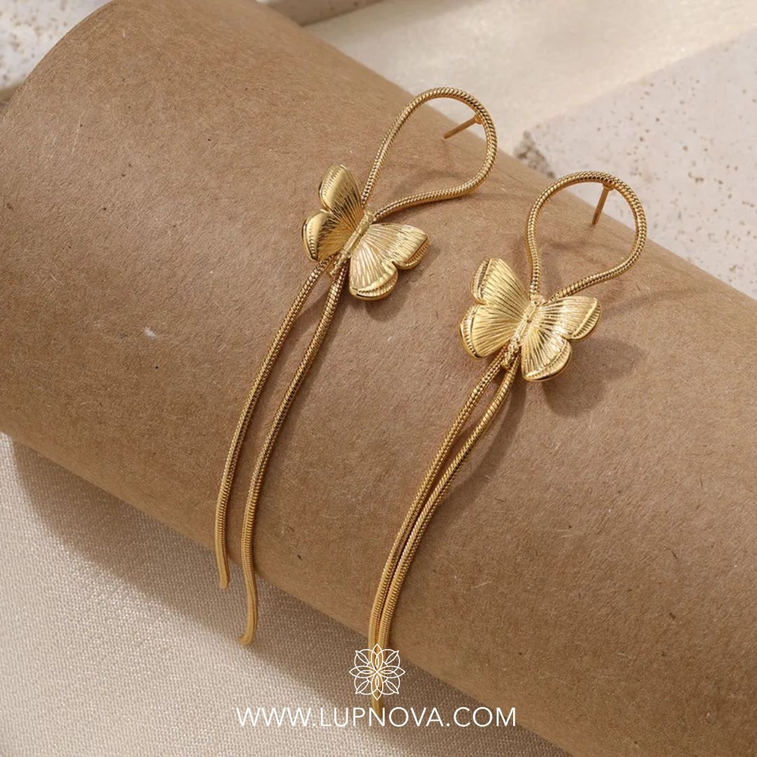 Los aretes Butterfly Drift están fabricados en acero inoxidable con baño de oro de 18k, y presentan un diseño delicado de mariposa acompañada por dos cadenas largas que se balancean suavemente al caminar. Su estética combina dulzura y modernidad en una pieza única.
