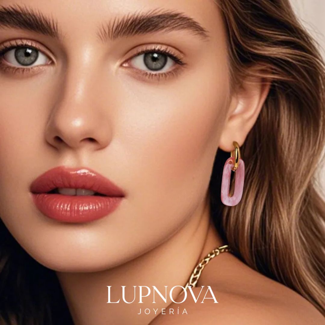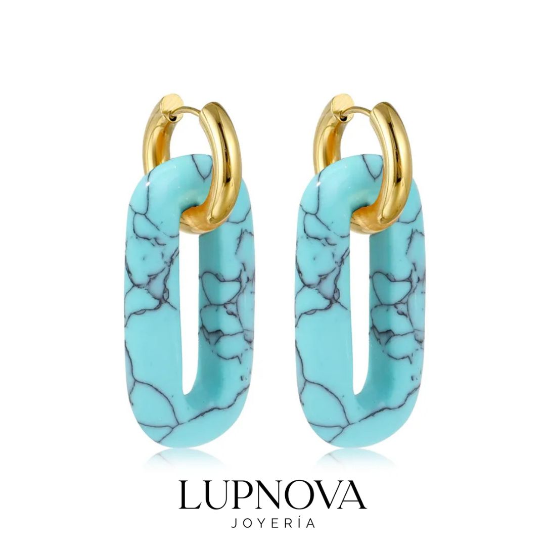 Aretes tipo aro de acero inoxidable con baño de oro 18k y dije rectangular de resina en tonos turquesa o sandía. Ligeros, hipoalergénicos y de tendencia; perfectos para dar un toque de color a looks casuales o de verano. Resistentes al agua y al deslustre, ideales para uso diario. Encuéntralos en Lupnova Joyería. Ancho de 1.5cm, alto de 3.8cm. Peso de 10 gramos el par.