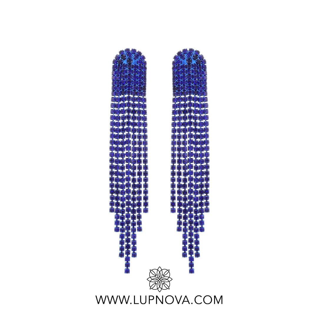 Aretes colganes de rhinestone con parte superior redonda. Ancho de 1.4 centímetros, alto de 8.5 centímetros. Peso de 11 gramos el par.