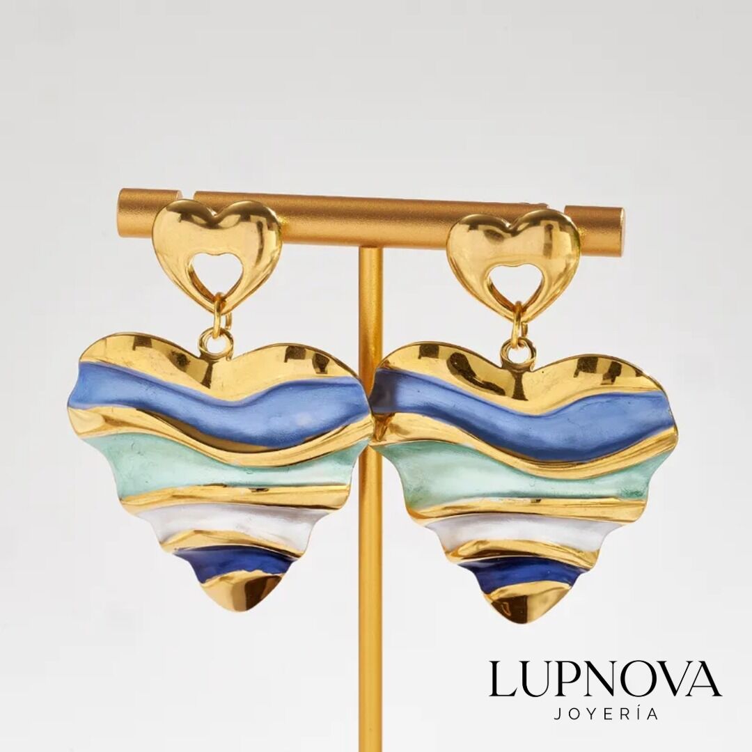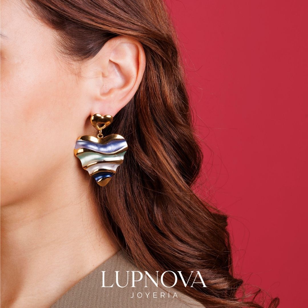 Aretes colgantes en forma de corazón con diseño ondulado en tonos azul, menta y blanco, con detalles dorados que aportan un look moderno y llamativo. Elaborados en acero inoxidable, son ideales para elevar outfits casuales y de verano, y también para darle color a un look neutro. Perfectos si buscas aretes de corazón de acero inoxidable con estilo coastal, ligeros, resistentes y fáciles de combinar. Ancho de 3.5cm, alto de 5.2cm. Peso de 26 gramos el par. Material acero inoxidable.