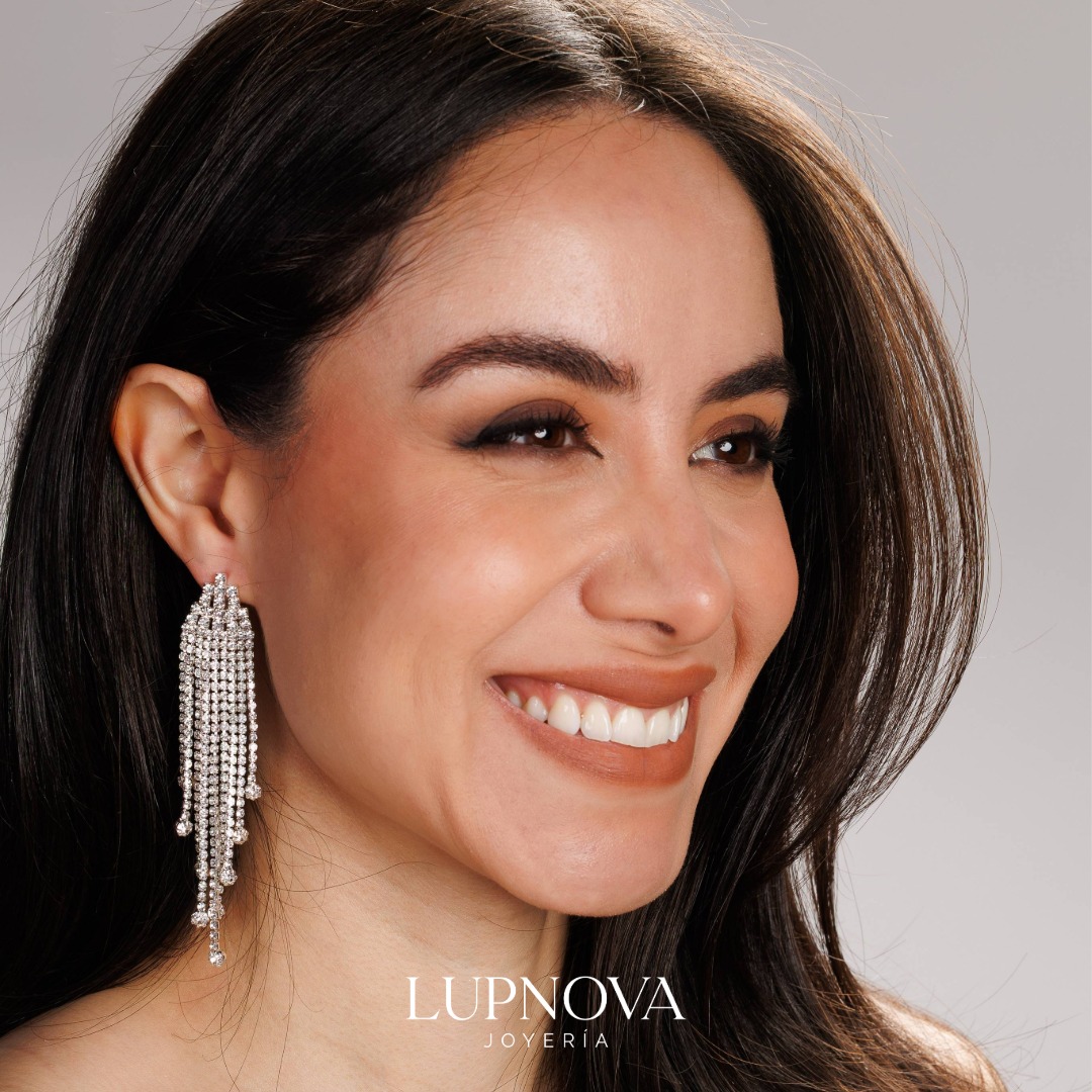 Aretes largos tipo cascada de cristales con diseño geométrico inspirado en el Art Déco. Livianos, de alto brillo y gran movimiento; perfectos para bodas, fiestas, graduaciones y looks de noche. Un must para quienes buscan aretes largos elegantes que eleven cualquier outfit. Disponible en Lupnova Joyería. Ancho de 1.8cm, alto de 9.5cm. Peso de 15 gramos el par.