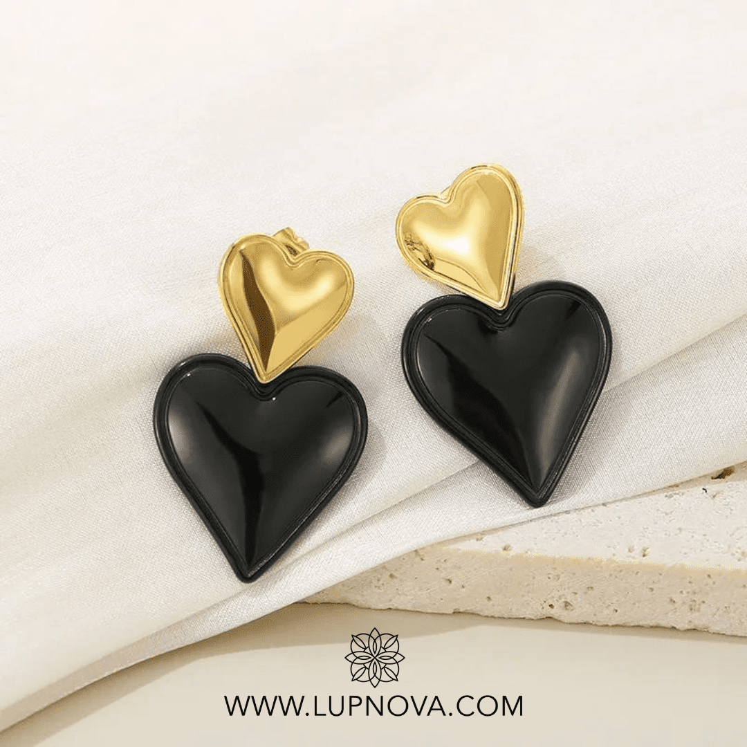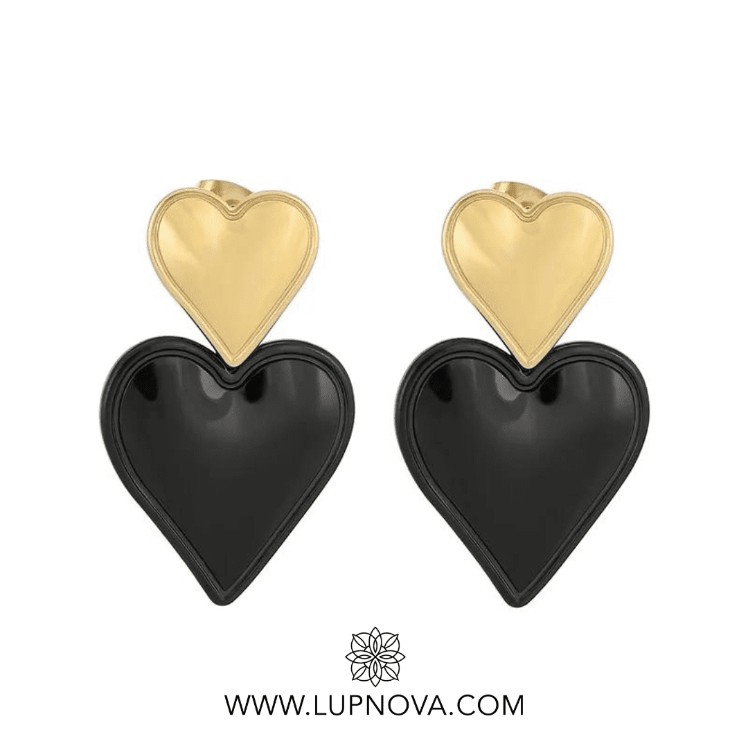 Aretes con doble corazón en color dorado y negro. Ancho de 2 centímetros, alto de 3.1 centímetros. Peso de 15 gramos el par. Material acero inoxidable.