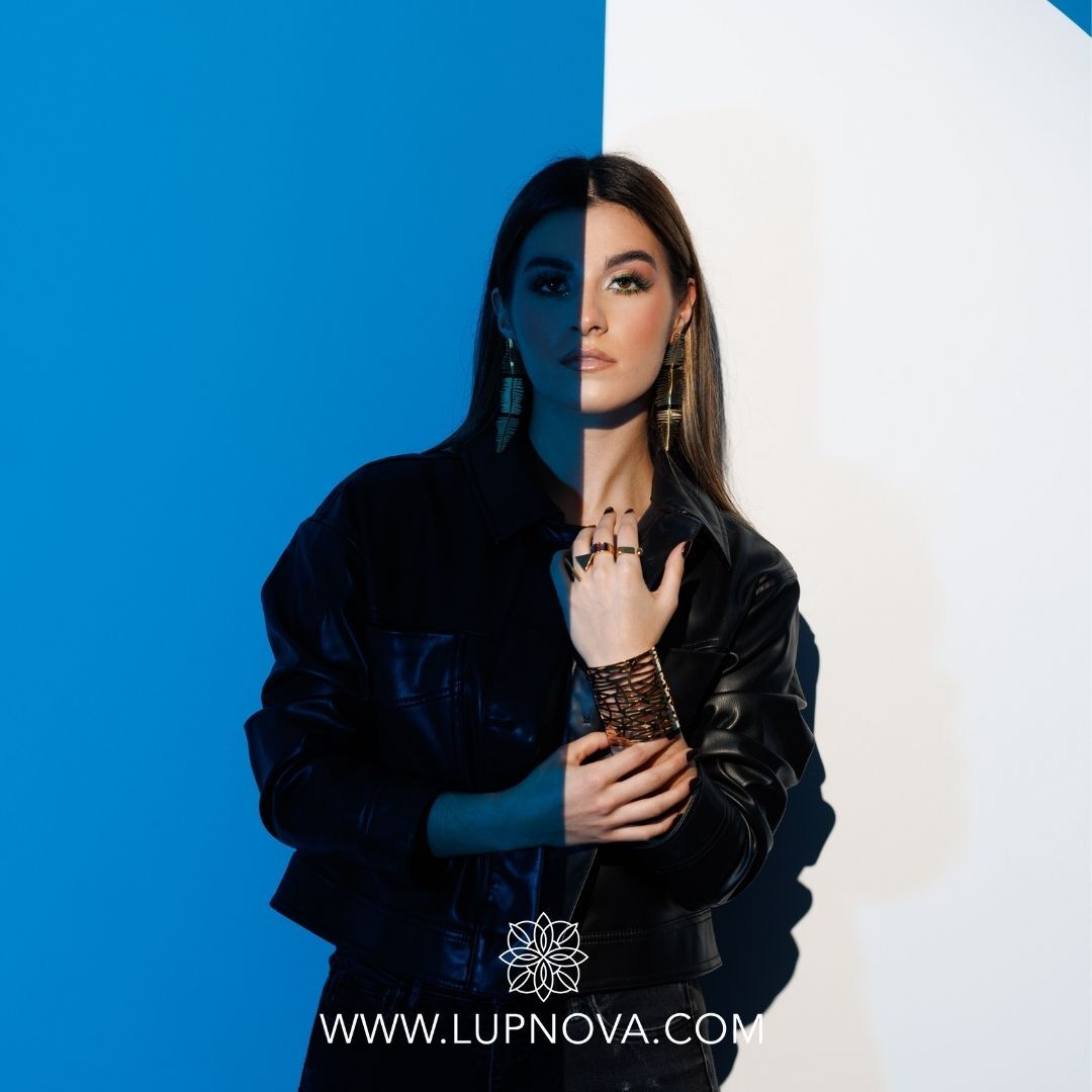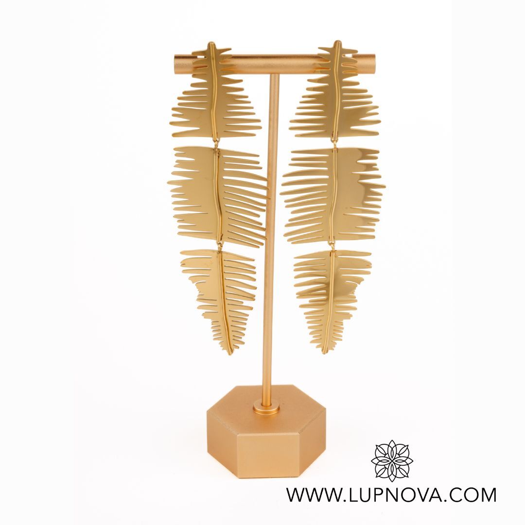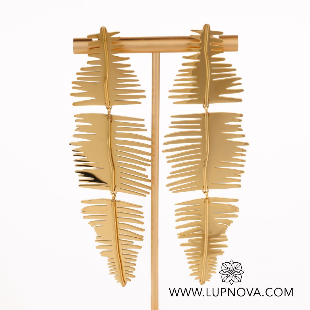 Aretes largos con diseño africano. Ancho de 3.2 centímetros, alto de 10 centímetros. Peso de 24 gramos el par. Material acero inoxidable con baño de oro 18k.