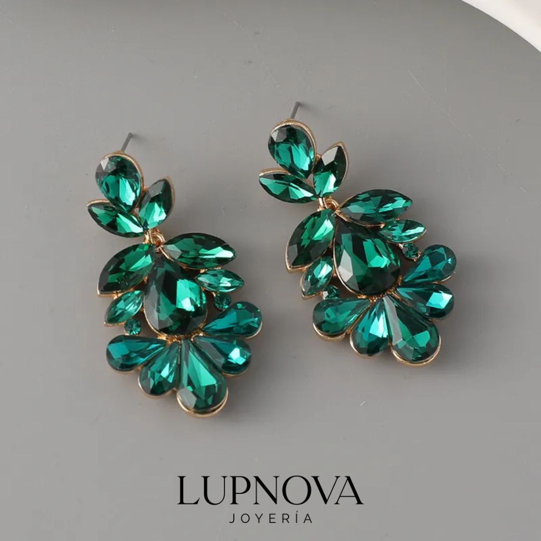 Aretes colgantes tipo statement con diseño floral de cristales/rhinestones facetados en forma de pétalos y gota, ideales para looks de fiesta, eventos y ocasiones especiales. Su brillo intenso y silueta llamativa aportan un estilo elegante, femenino y glamuroso. Perfectos para quienes buscan aretes largos de fiesta para mujer, con acabado brillante y presencia sofisticada. Ancho de xcm, alto de xcm. Peso de 24 gramos el par.