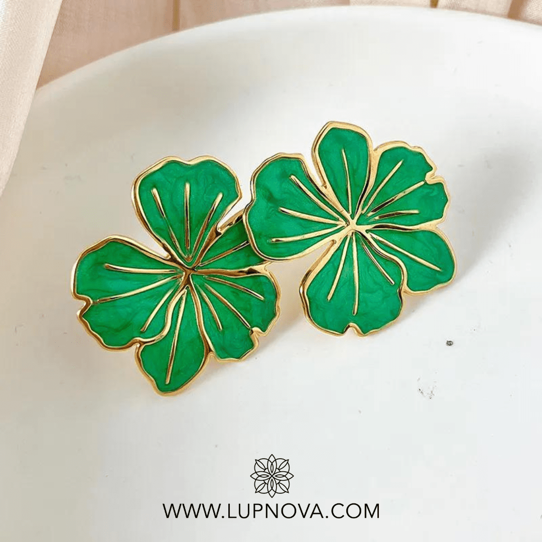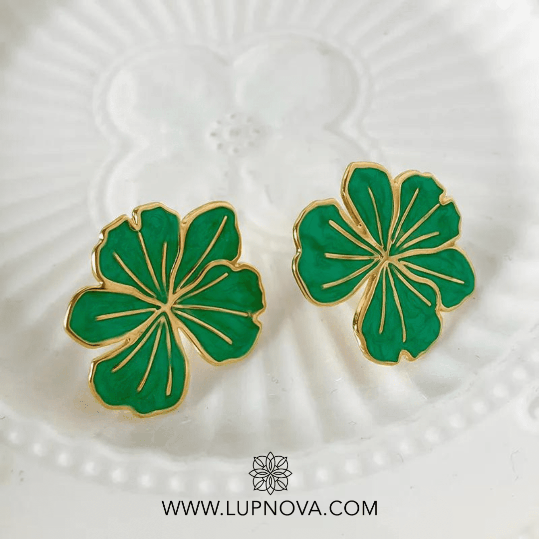 Aretes en forma de geranio con color en porcelana verde. Diámetro de 3 centímetros. Peso de 12 gramos el par.