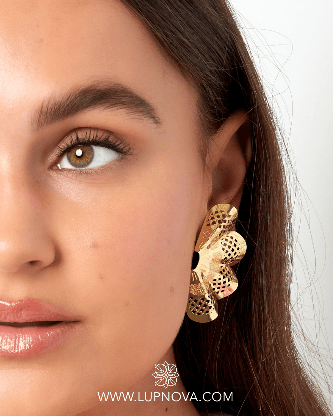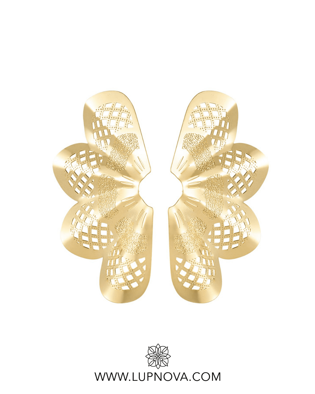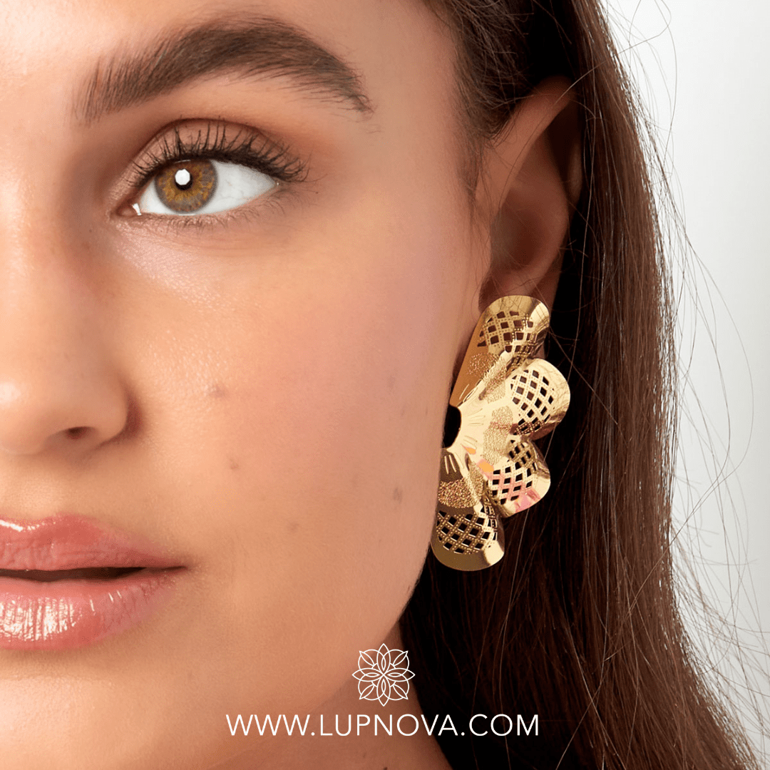 Aretes calados en forma de flor en forma de abanico. Ancho de 2.8 centímetros, alto de 5 centímetros. Peso de 7 gramos el par.