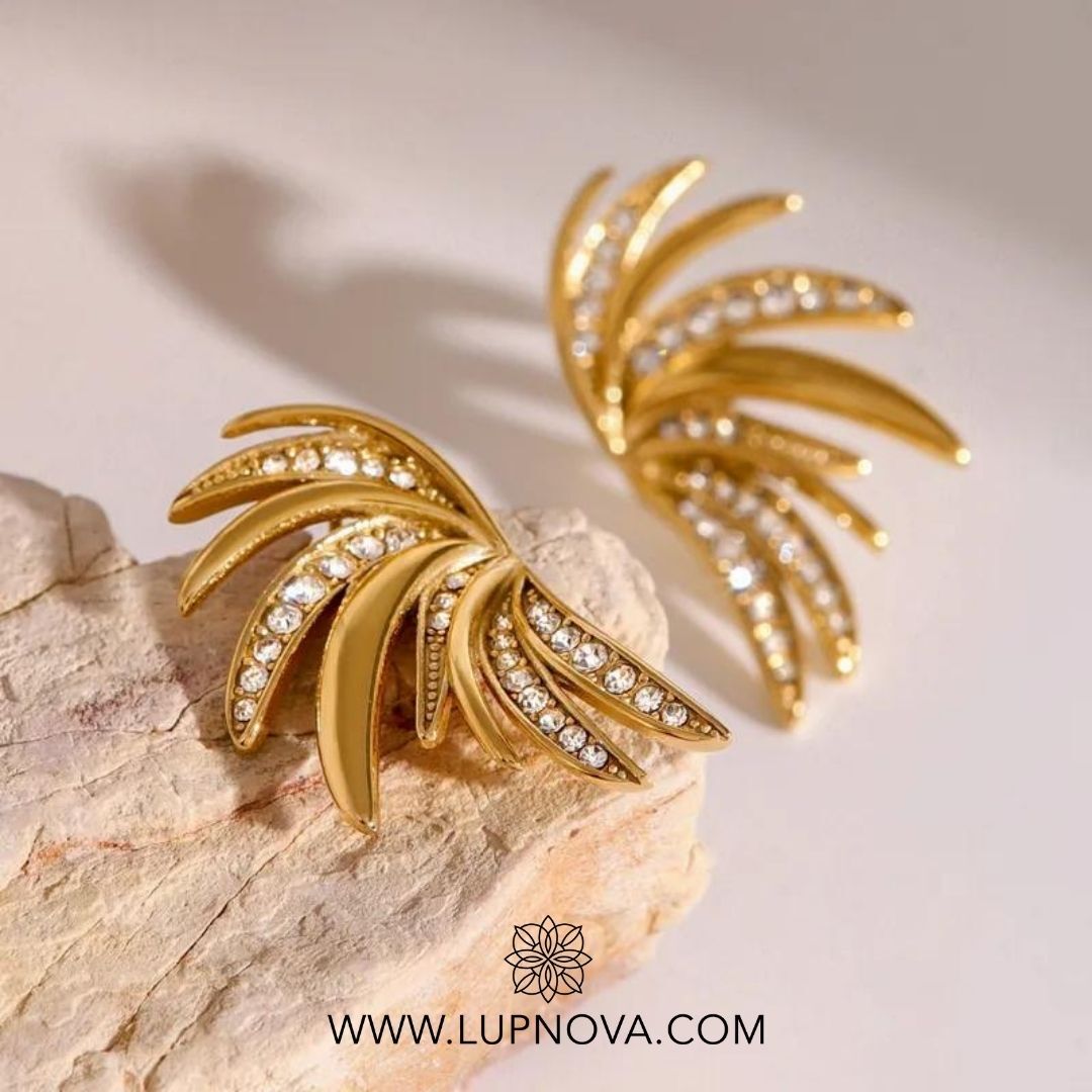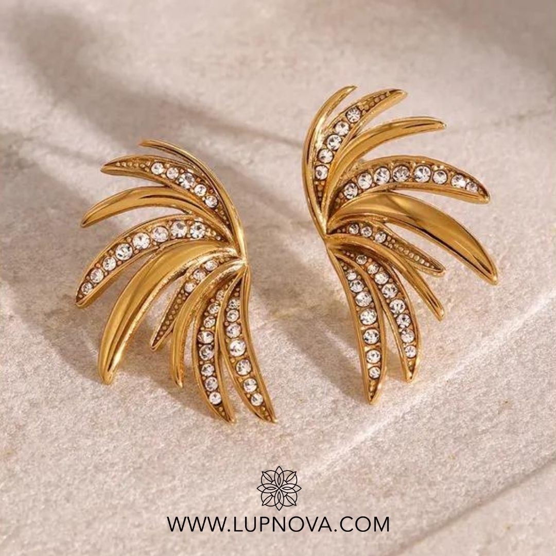 Aretes con diseño de alas. Inserción de circonia cúbica. Ancho de 1.8 centímetros. Alto de 3.2 centímetros. Peso de 11 gramos el par.