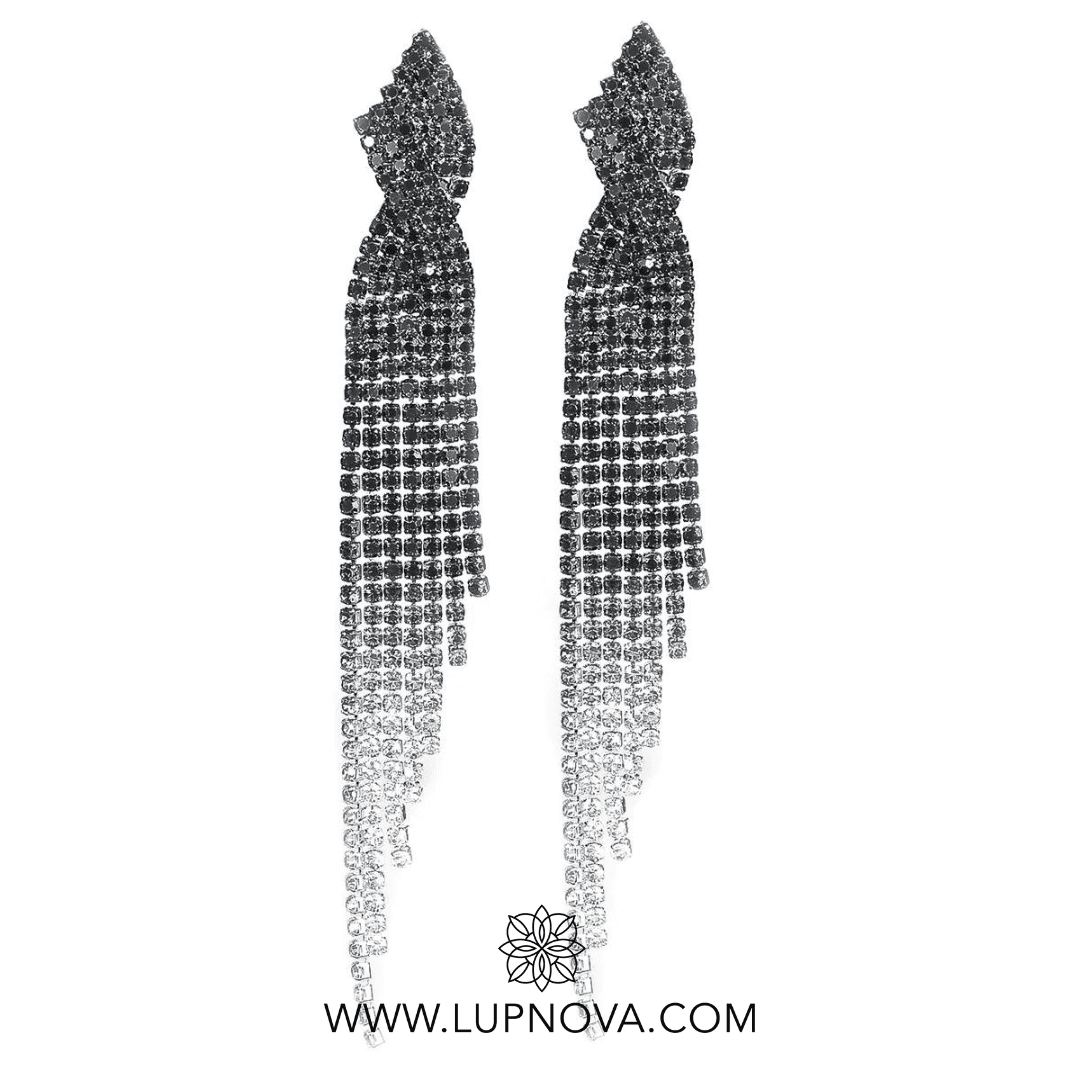 Aretes colgantes de rhinestone con diseño re rombo y colo en degradé. Ancho de 1.3 centímetros, alto de 11.3 centímetros. Peso de 17 gramos el par.