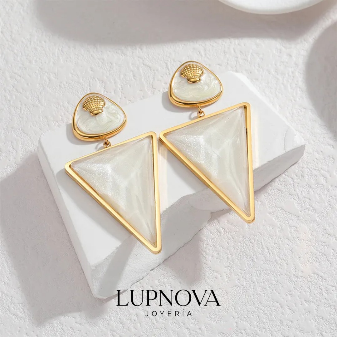 Aretes colgantes con diseño geométrico en triángulo, con acabado nacarado en tono menta o blanco perlado, enmarcados con borde dorado y detalle superior con conchita. Elaborados en acero inoxidable, son ligeros, resistentes y perfectos para looks de verano, playa o para darle un toque elegante a un outfit básico. Ideales si buscas aretes triangulares de acero inoxidable, con estilo coastal y brillo tipo nácar. Ancho de 3cm, alto de 6cm. Peso de 17.5 gramos el par.