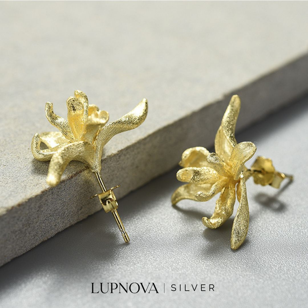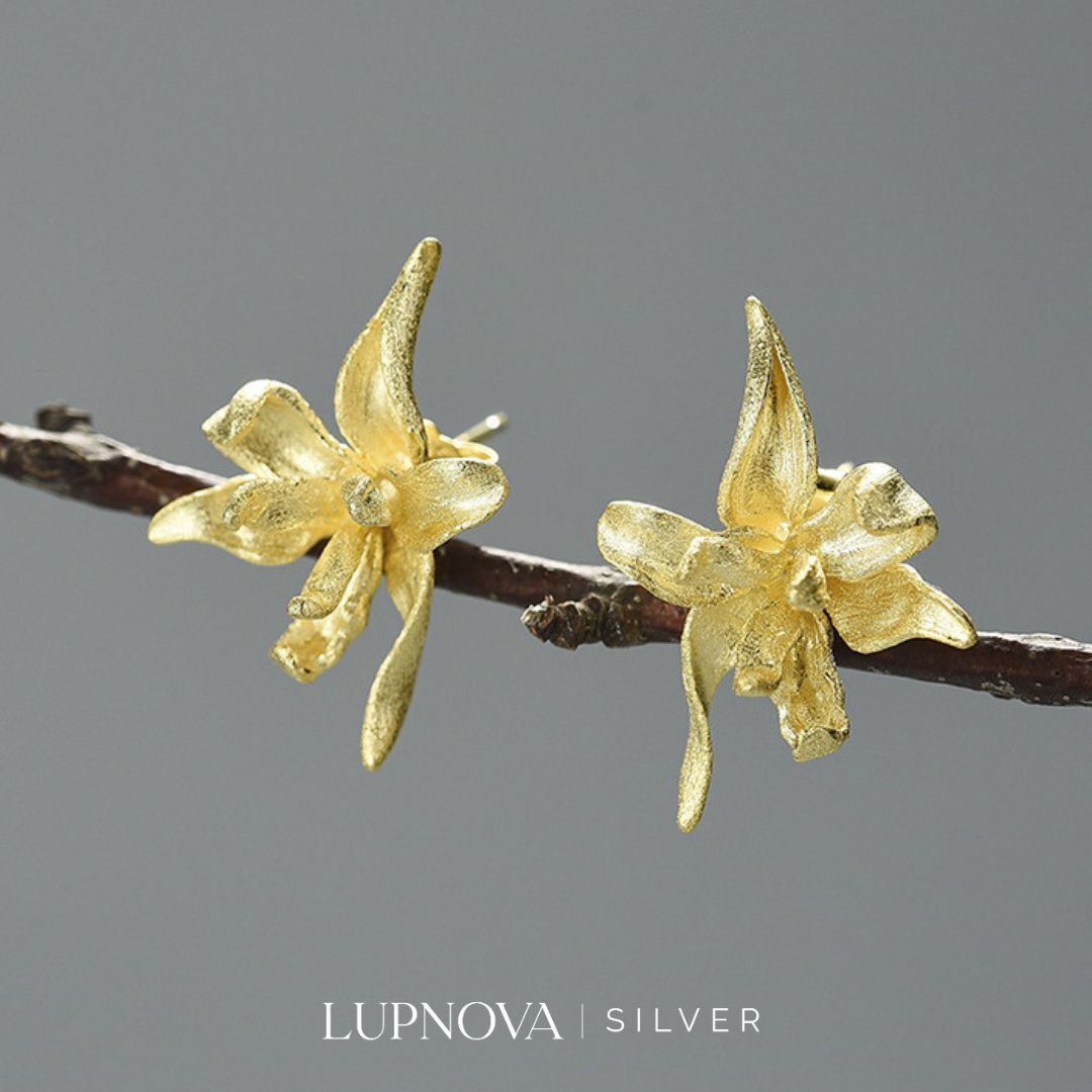 Aretes tipo stud con diseño de orquídea. Ancho de 2cm, alto de 2.5cm. Peso de 4 gramos el par. Material plata925.