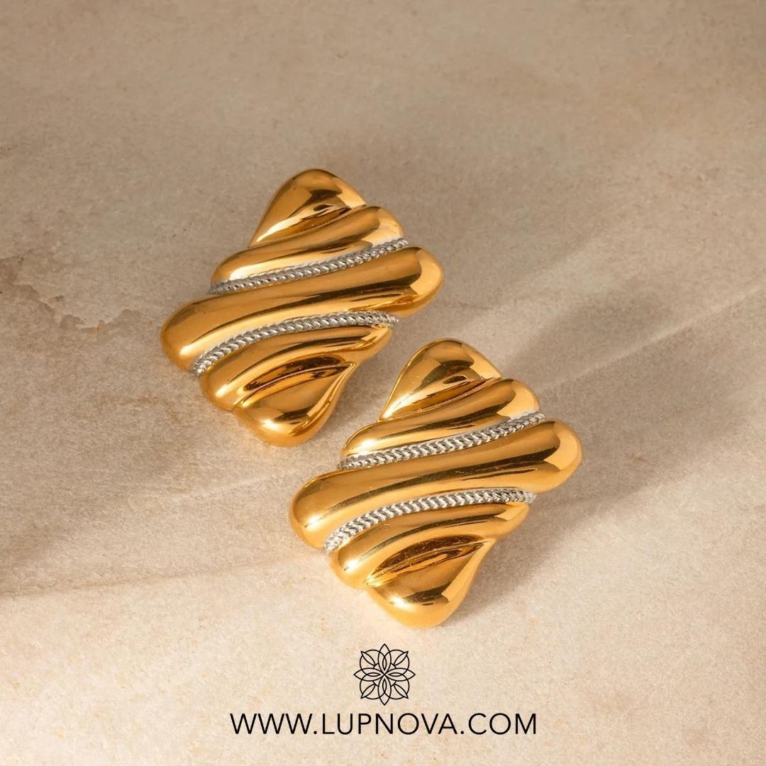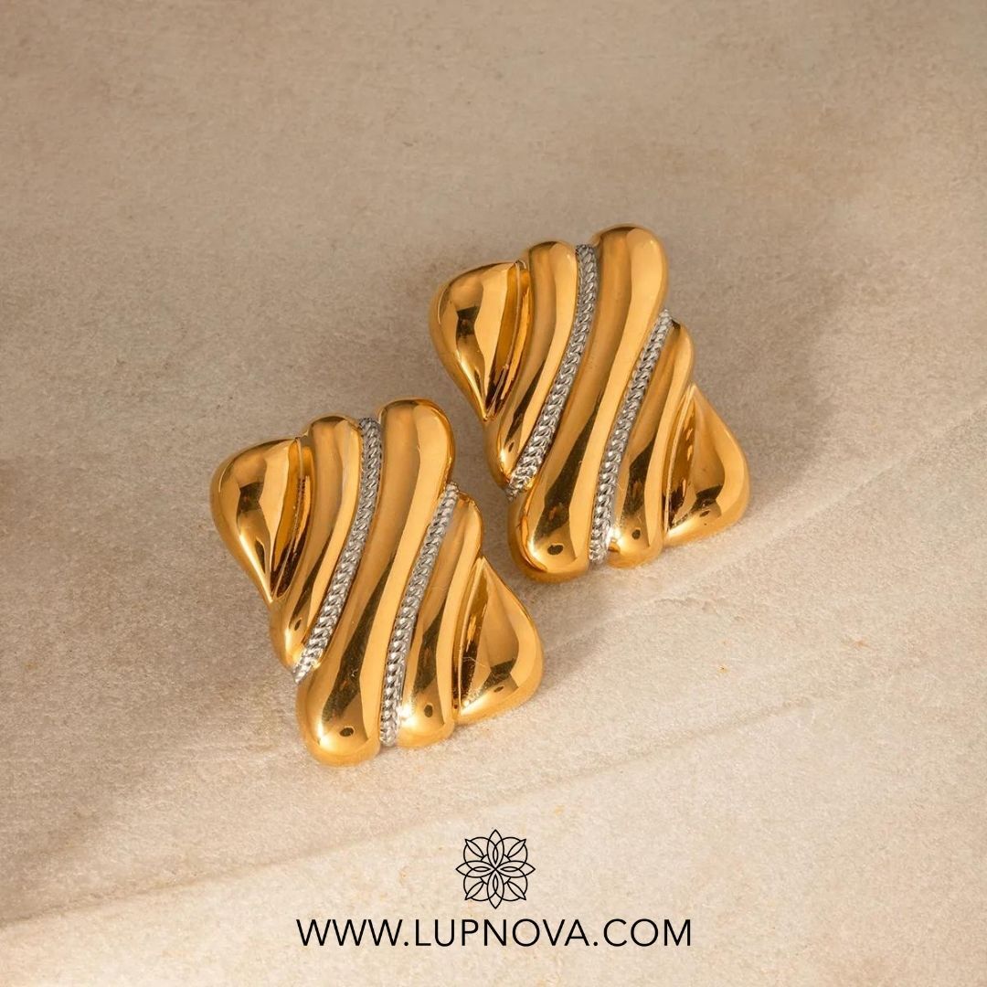 Aretes con forma contemporánea. Ancho de 2.8cm alto de 3.8cm peso de 25 gramos el par. Material acero inoxidable con baño de oro 18k.