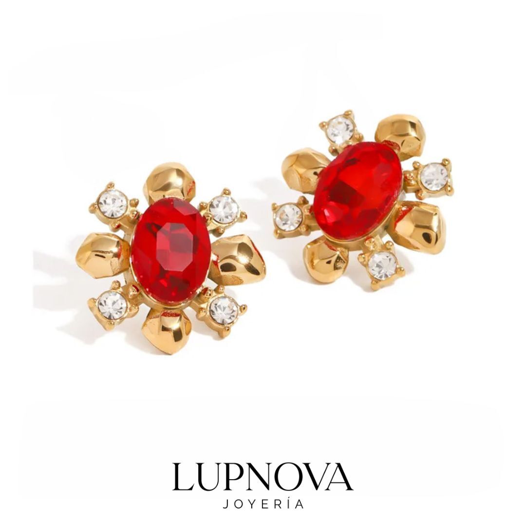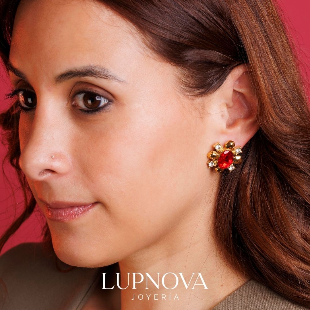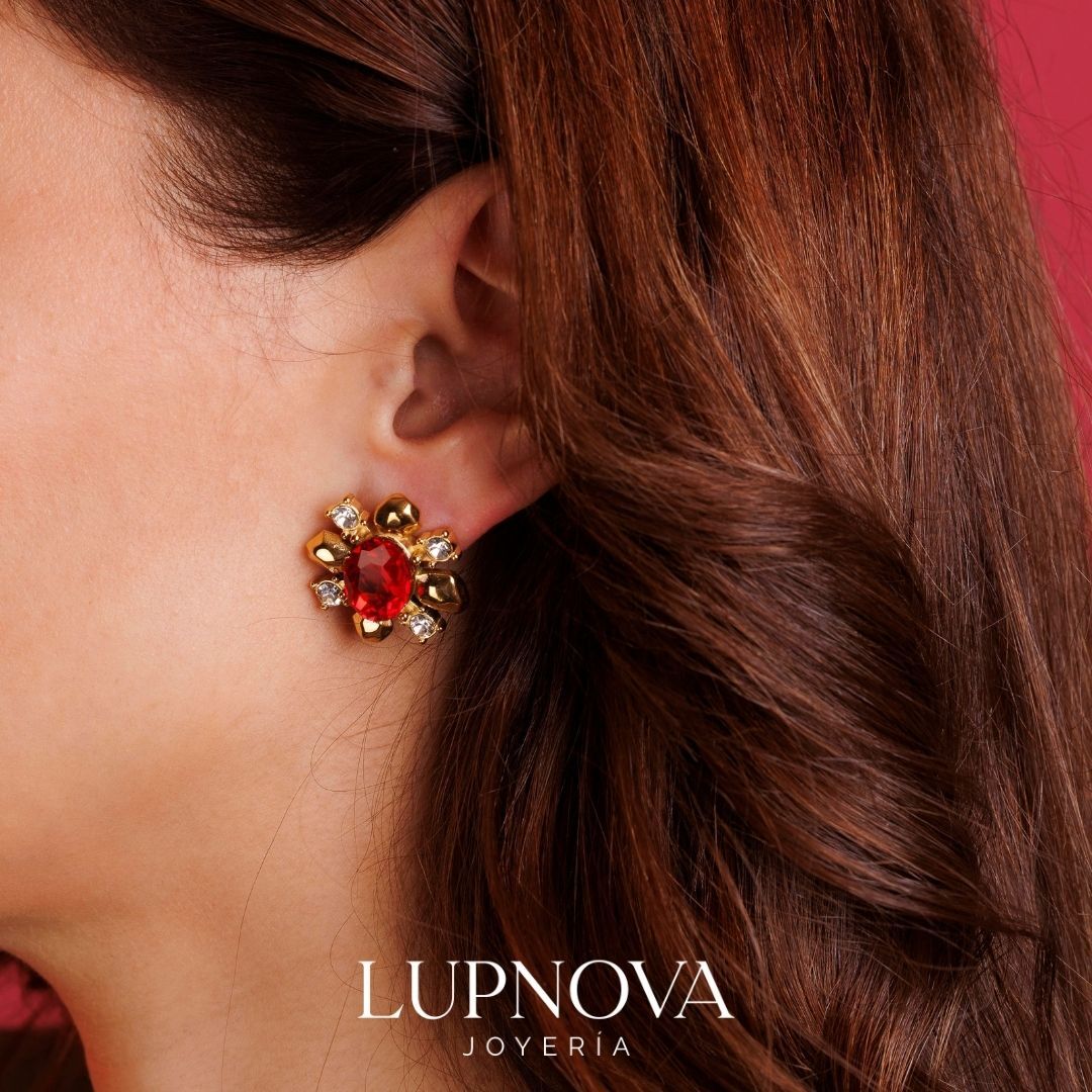 Aretes de acero inoxidable con diseño floral con baño de oro 18k, piedra central roja tipo cristal y detalles brillantes. Un estilo elegante y llamativo, ideal para elevar looks de fiesta o darle un toque sofisticado a tu outfit diario. Ancho de 2.5cm, alto de 2.5cm. Peso de 16 gramos el par. Material acero inoxidable.