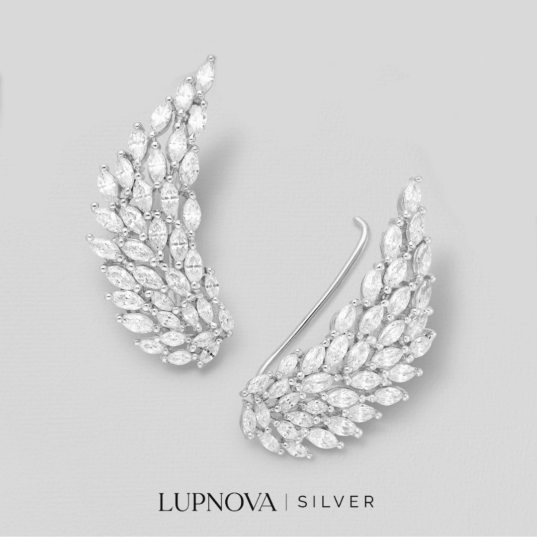 Aretes con forma de alas con incrustaciones de circonia cúbica en estilo de engaste de puntas(prong setting). Pin largo. Ancho de 1.3 centímetros, alto de 3.4. Peso de 7 gramos el par.