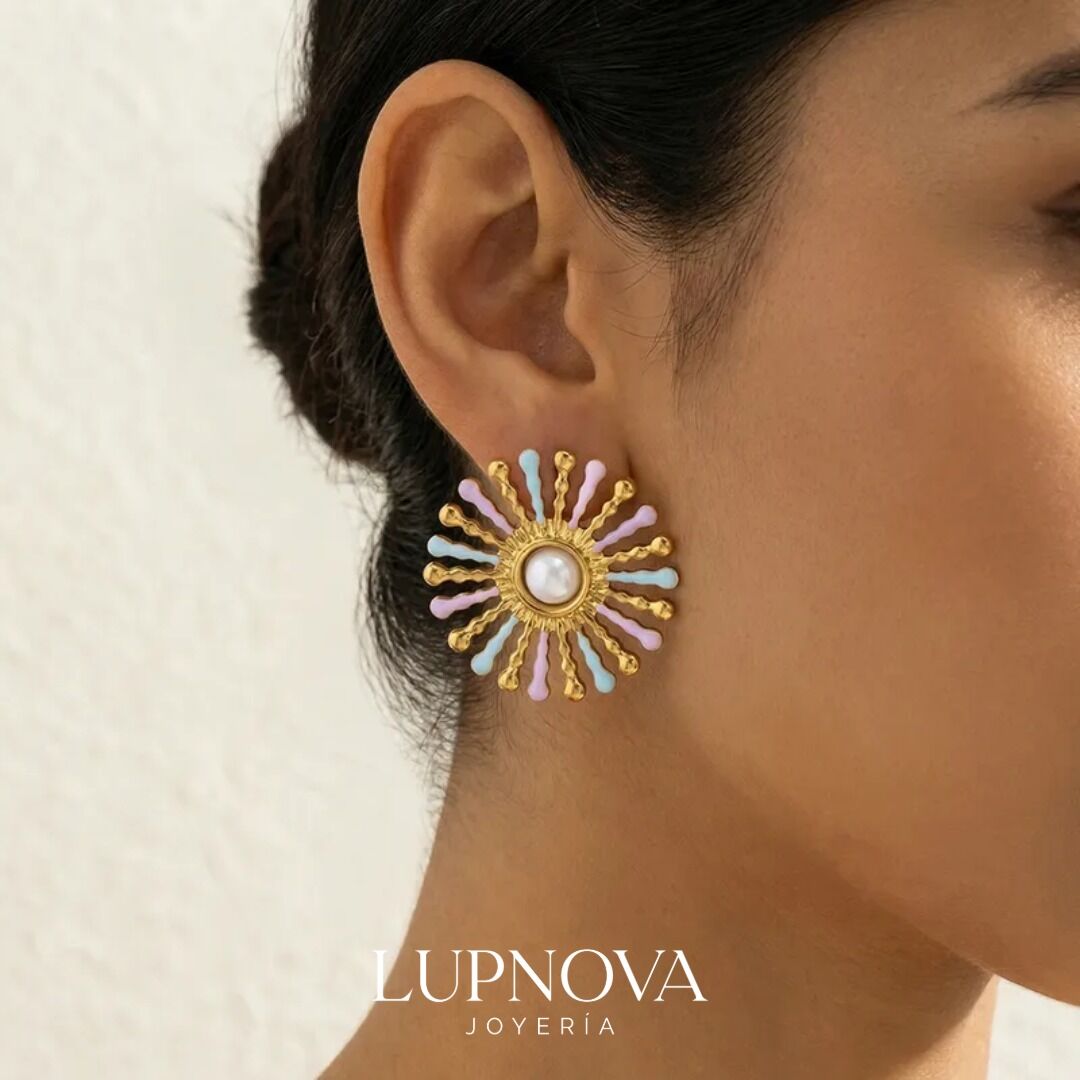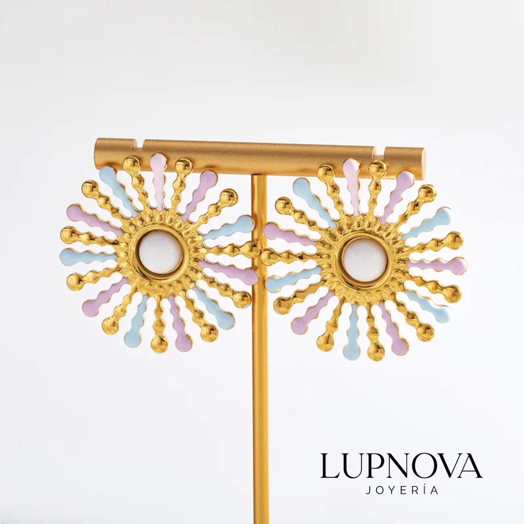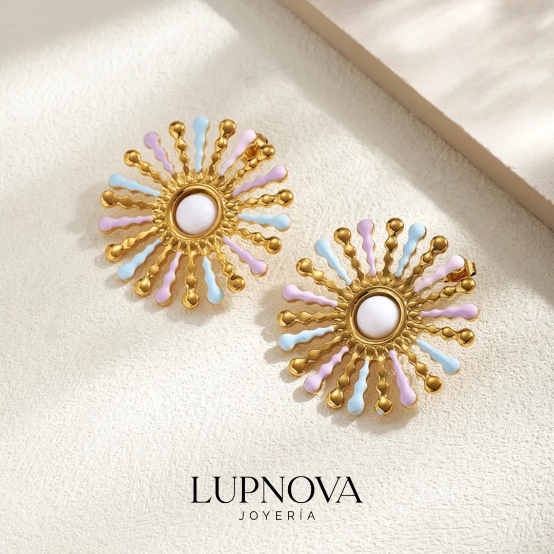 Aretes tipo stud en forma de sol con rayos texturizados y detalles en tonos pastel (lila y celeste), con centro blanco que aporta un contraste elegante. Elaborados en acero inoxidable, son ideales para darle un toque alegre y moderno a tus looks diarios, vacaciones o eventos de día. Perfectos si buscas aretes de sol de acero inoxidable, resistentes, ligeros y fáciles de combinar.