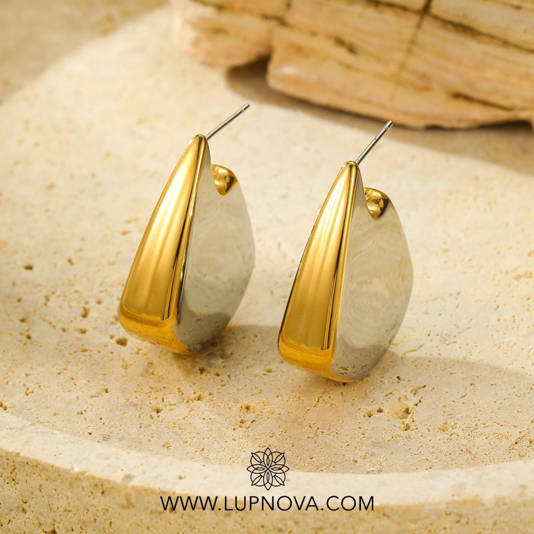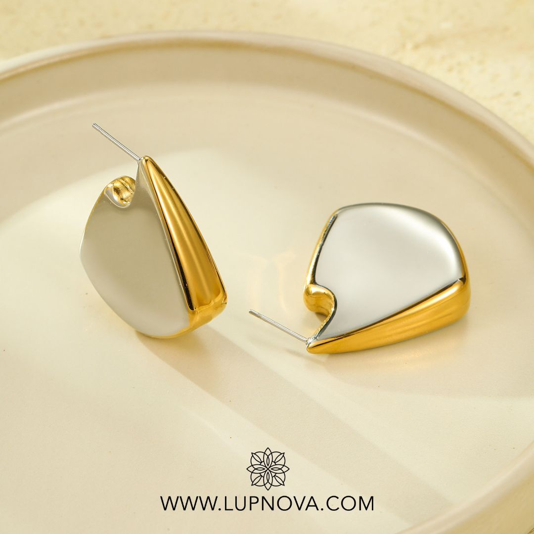 Aretes statement con forma de bloque irregular. Ancho de 3cm, alto de 3.3 cm. Peso de 16 gramos el par. Material acero inoxidable.