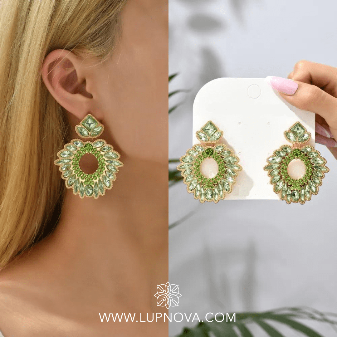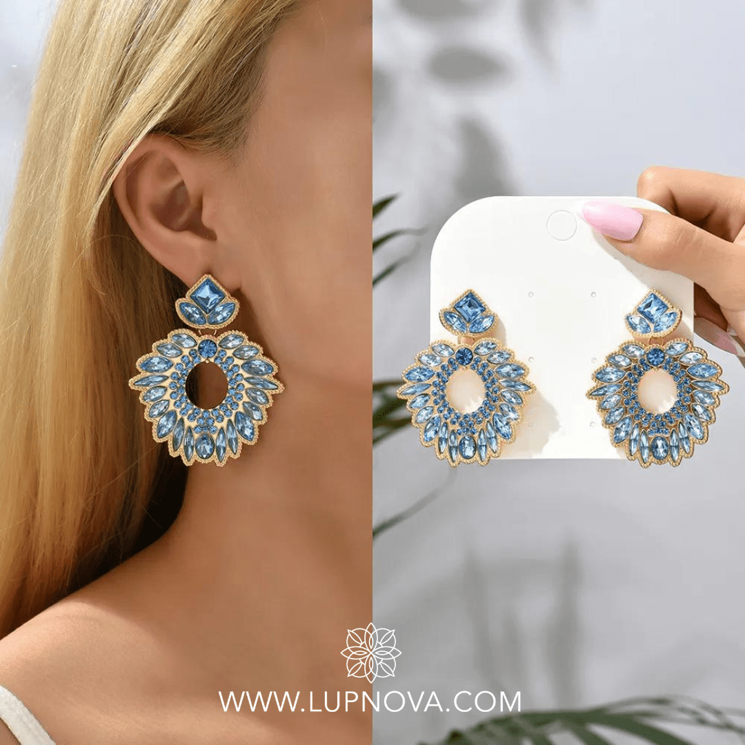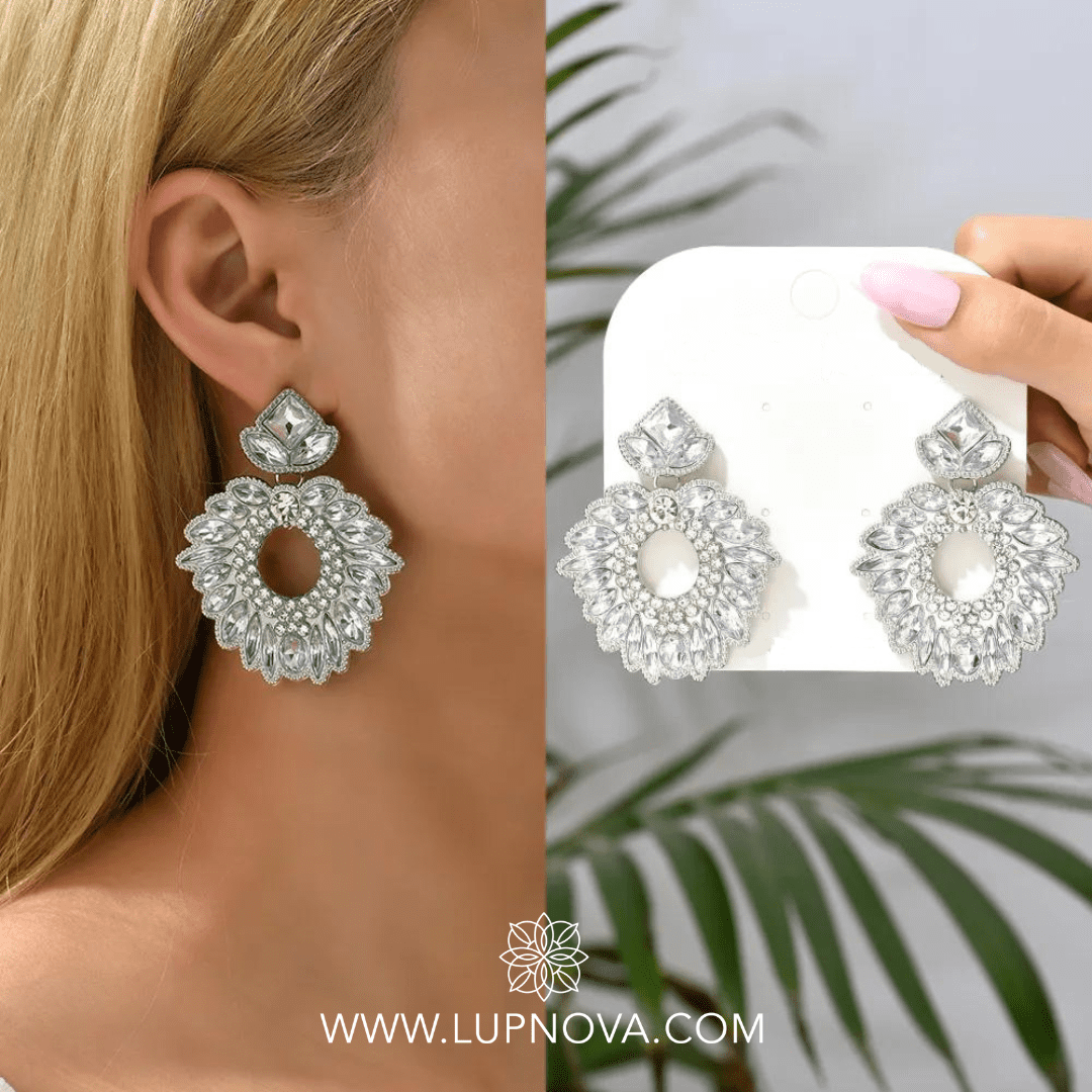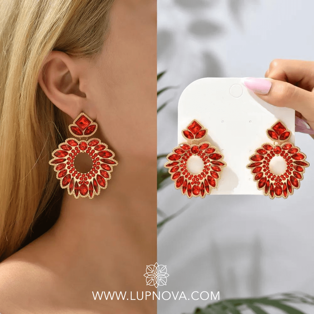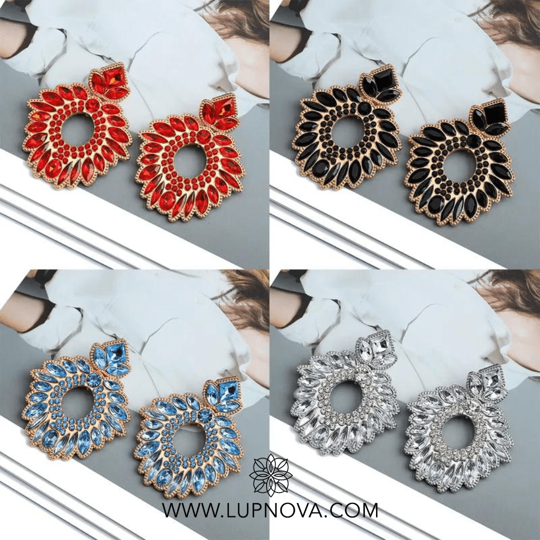 Aretes con forma de corona con inserción de cristales. Ancho de 4.9 centímetros, alto de 6 centímetros. Peso de 22 gramos el par.