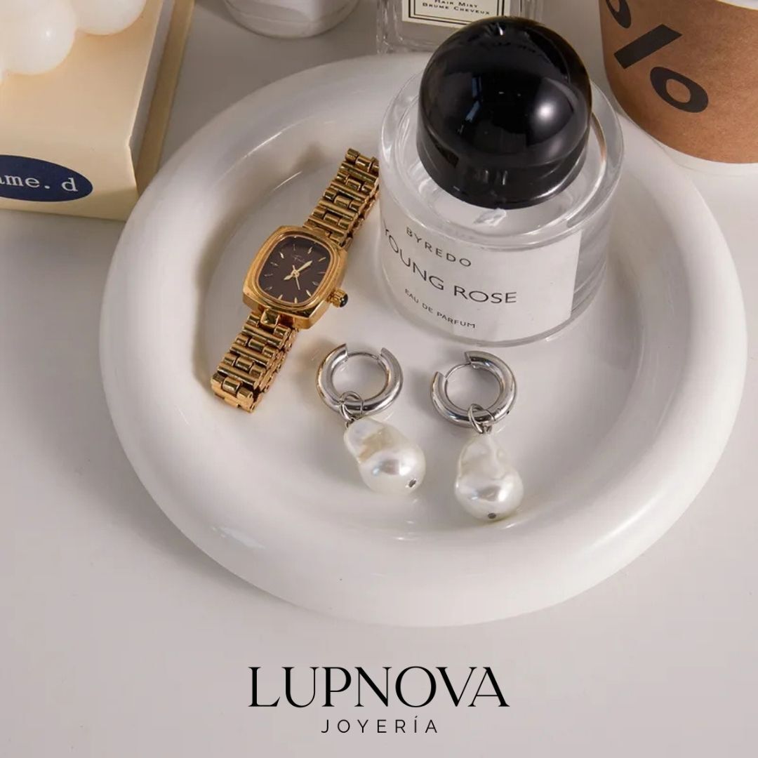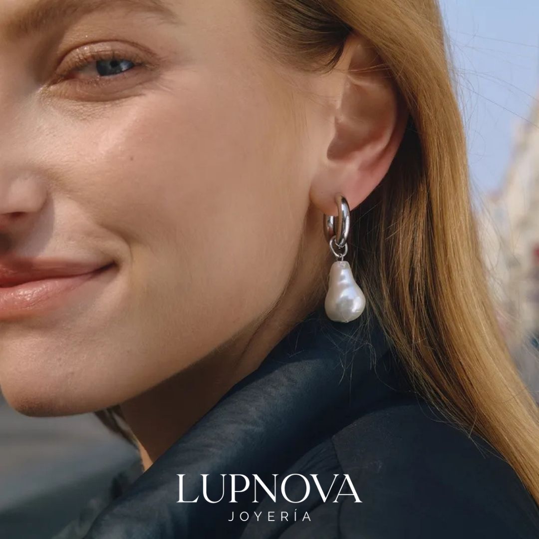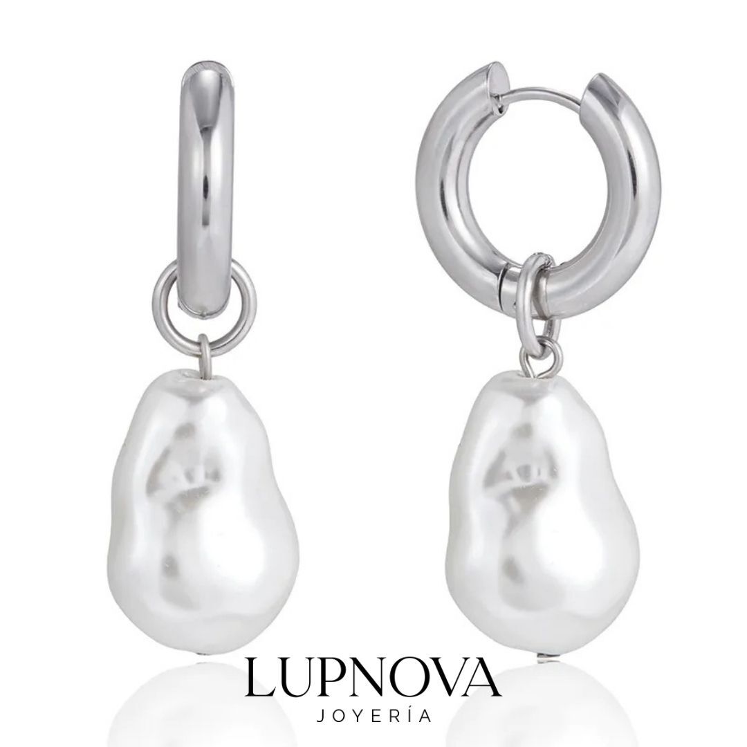 Aretes de aro en acero inoxidable con perla barroca colgante de gran tamaño. Su forma orgánica e irregular le da un carácter único y sofisticado, perfecto para looks casuales y formales. Resistentes a la oxidación y aptos para pieles sensibles. Una pieza atemporal que combina lo natural con lo moderno. Disponibles en Lupnova Joyería. Ancho de 1.5 cem, alto de 4.5cm, peso de 18 gramos el par.