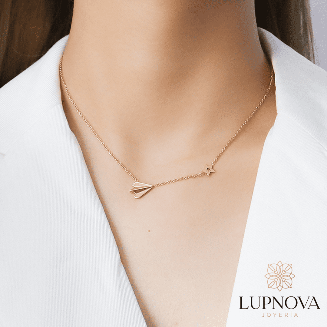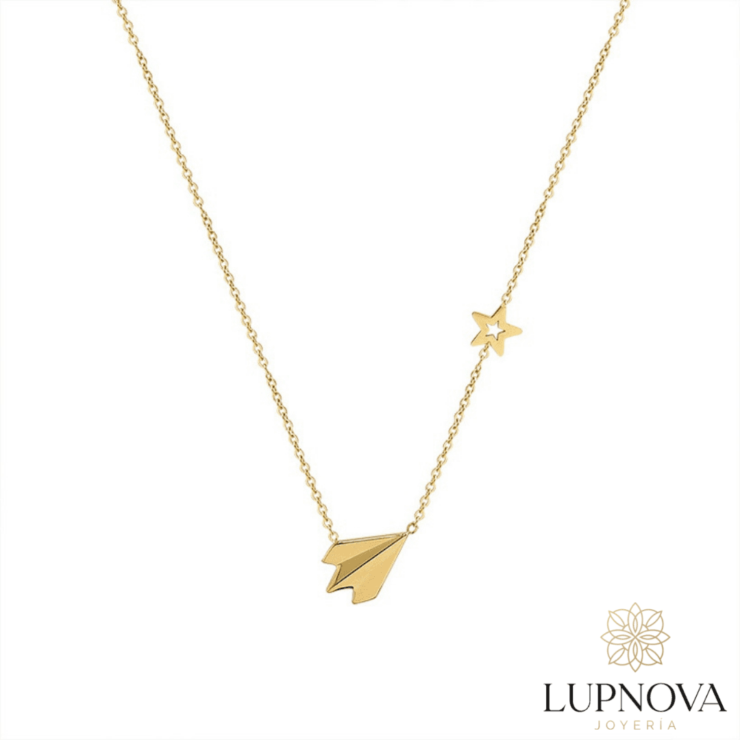 Cadena con dije de avión de papel. Material acero de titanio(superior a acero inoxidable) con baño de 18k.