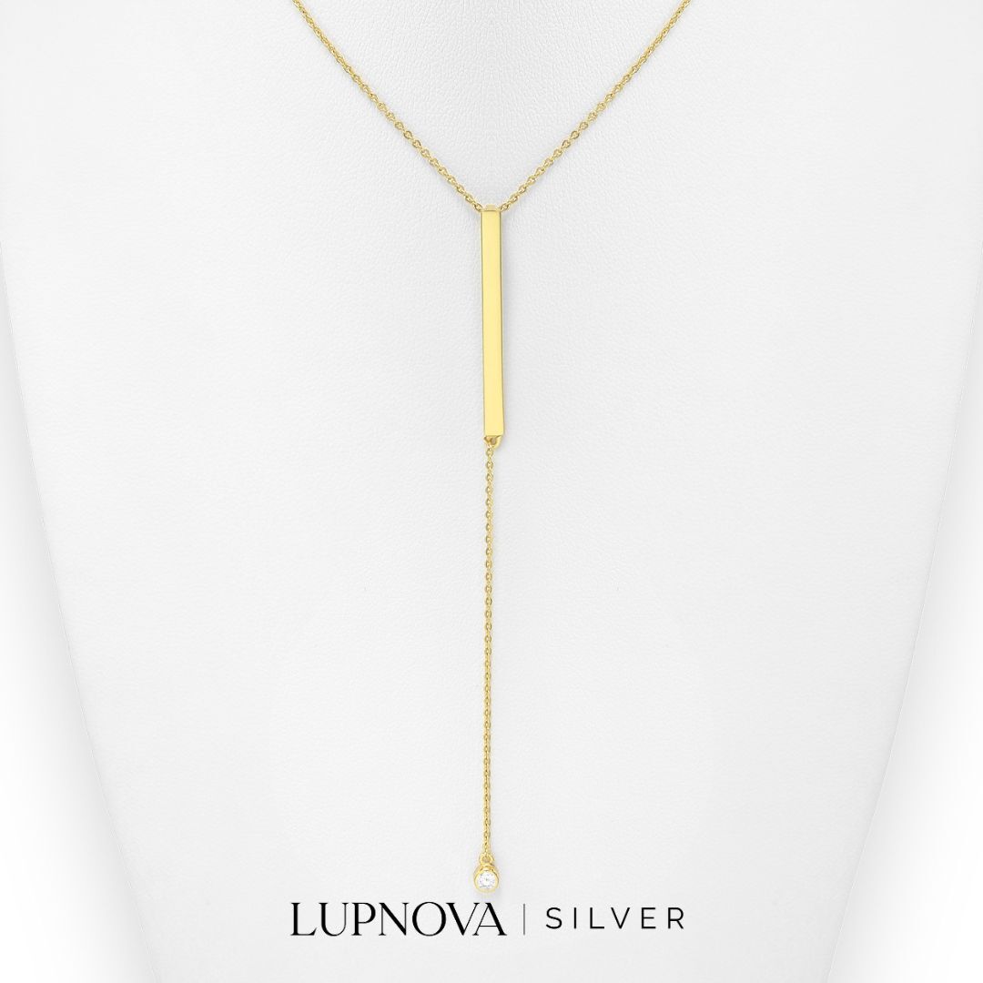 Cadena con un colgante de barra y punta de rhinestone. La cadena tiene un largo de 42 centímetros más extensión de 5 centímetros. Material plata 925 con proceso de galvanoplastia en oro 14k.