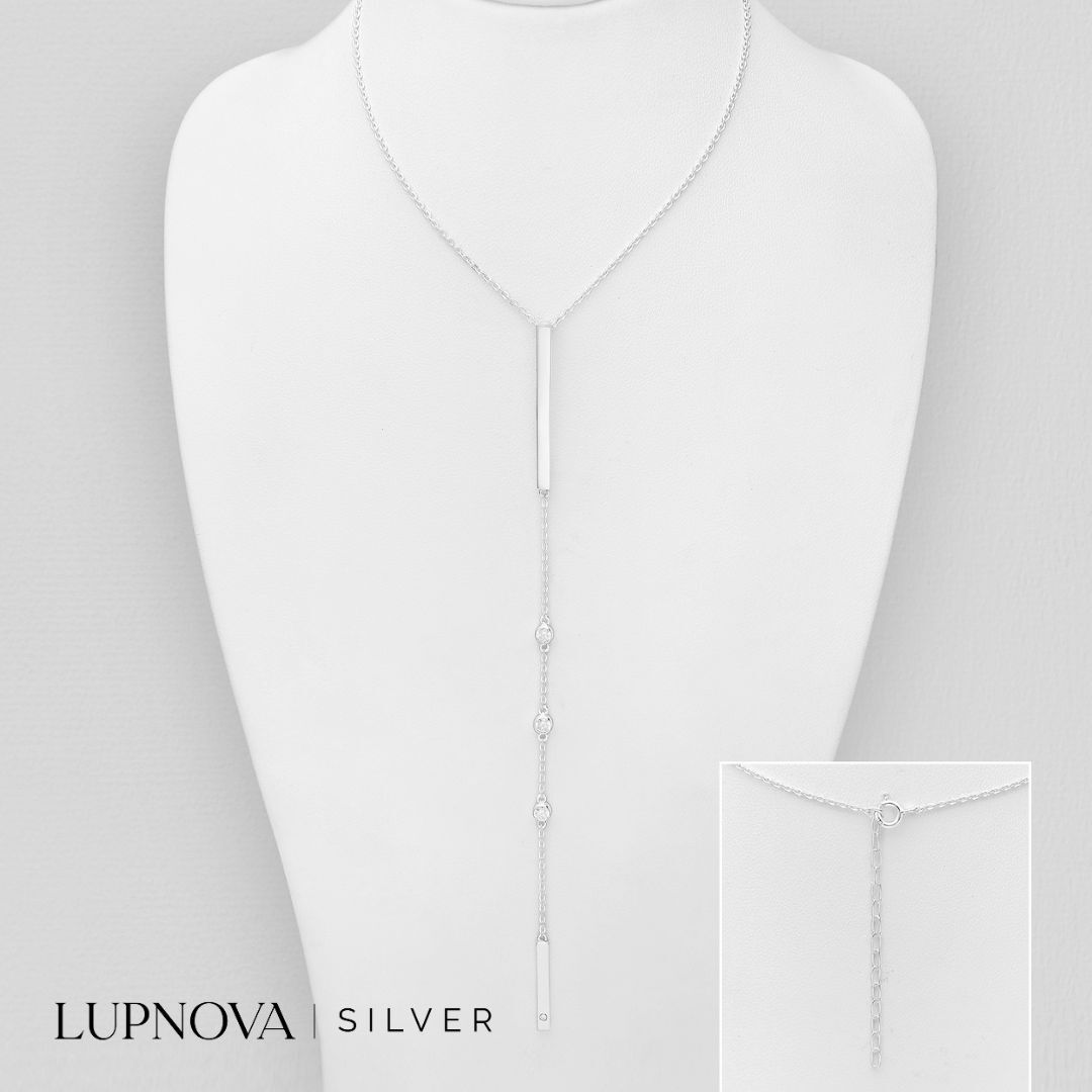 Cadena con colgante de barras y esferas de rhinestones. La cadena tiene un largo de 42 centímetros más extensión de 5 centímetros. Material plata925.