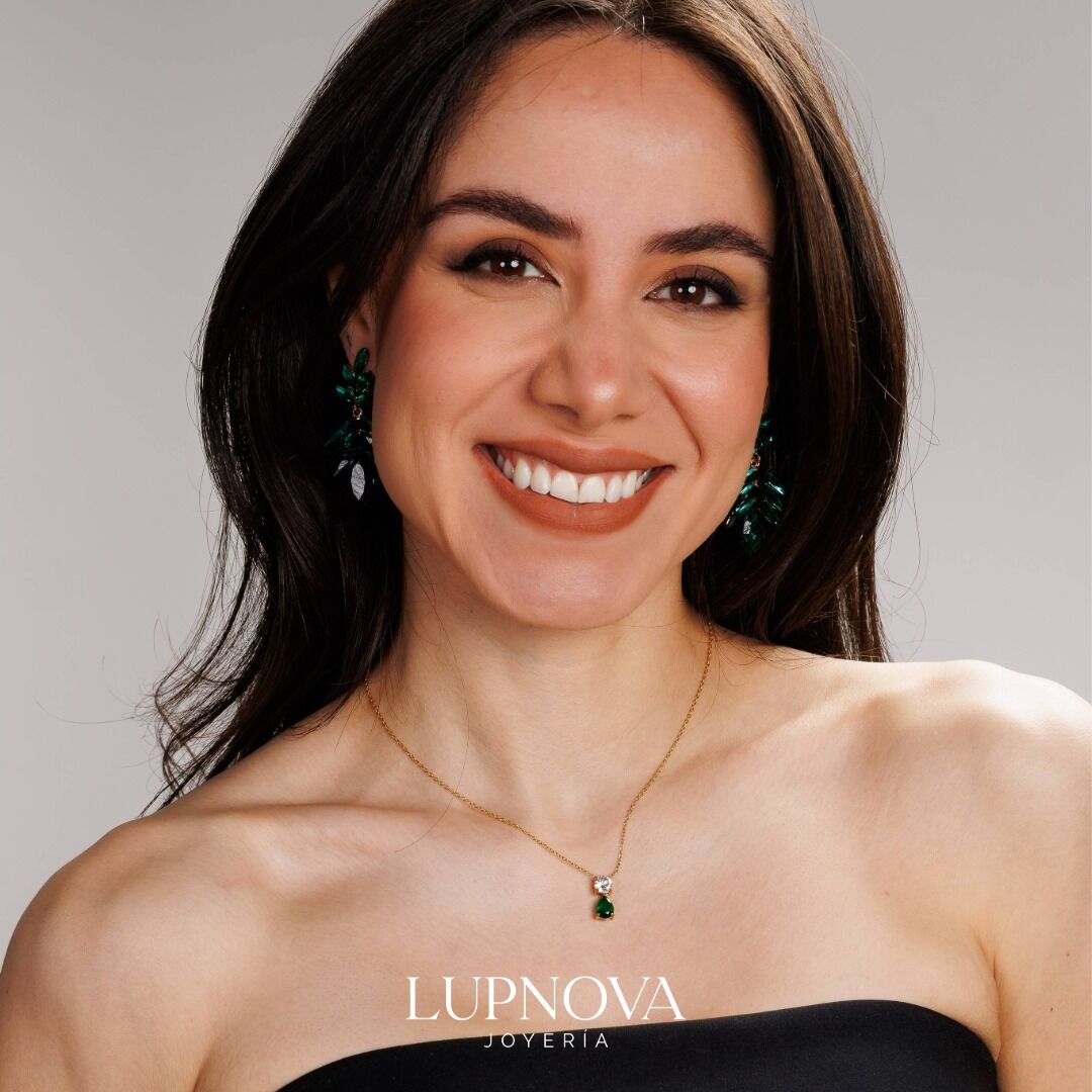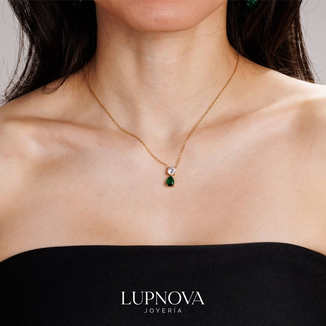 Cadena fina de acero inoxidable con baño de oro 18k y dije de dos piedras: corte cushion arriba y gota colgante abajo. Un collar minimalista, hipoalergénico, resistente al agua y al deslustre, ideal para layering o llevar solo. Largo ajustable para un calce perfecto. Un básico versátil de Lupnova Joyería para realzar cualquier look diario o de noche. La cadena tiene un largo de 40cm, más una extensión de 5cm