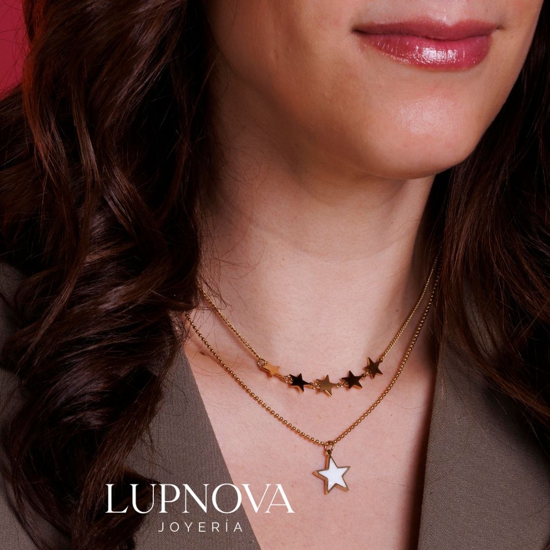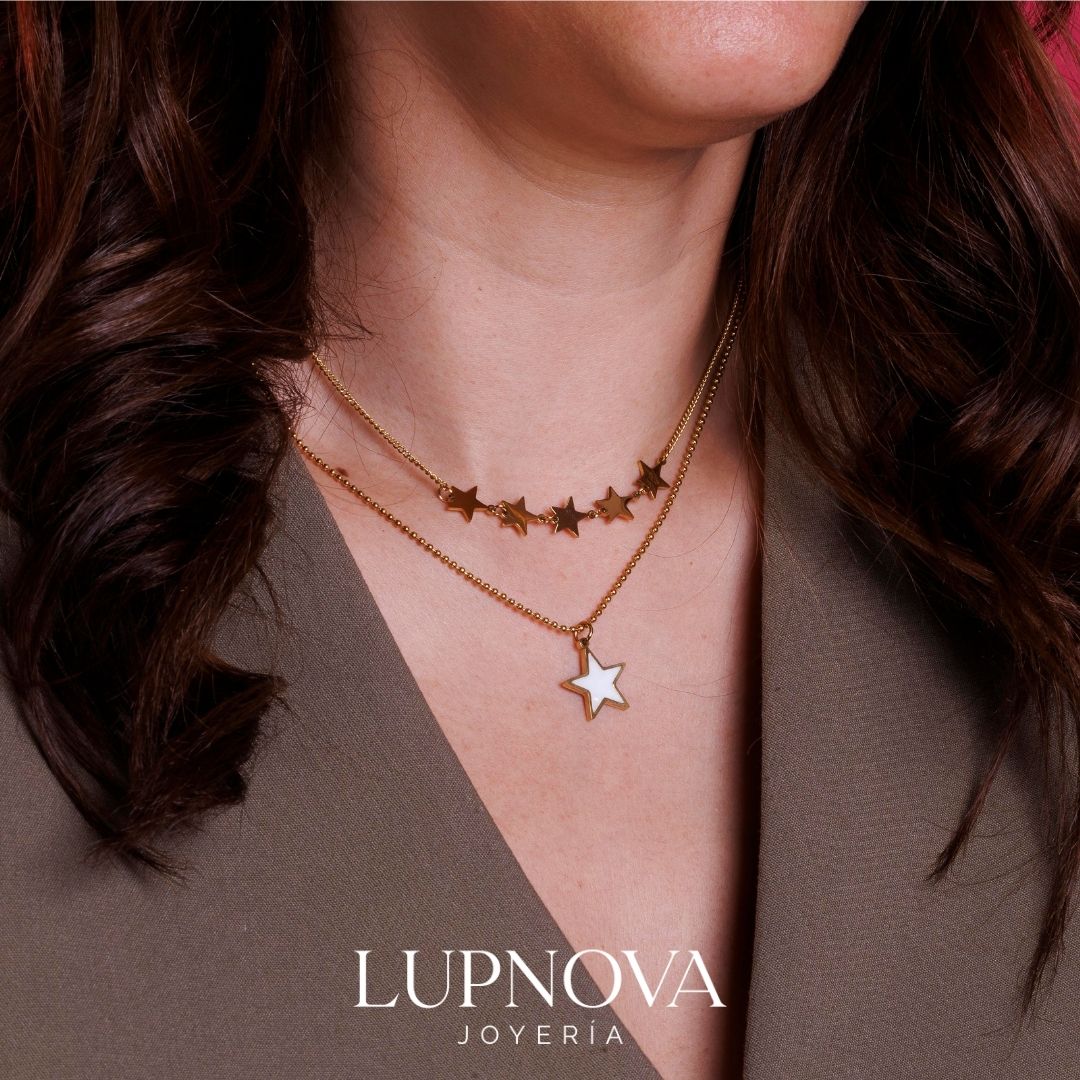 Collar doble capa de estrellas en acero inoxidable con baño de oro 18K. La primera cadena lleva pequeñas estrellas doradas y la segunda luce un dije de estrella con centro tipo nácar, creando un efecto moderno y luminoso. Ideal como collar de estrellas dorado para uso diario o para darle un toque trendy a cualquier outfit. La cadena tiene un largo de 40cm, más una extensión de 5cm. Las cadenas están unidas por el broche no pueden usarse por separado.