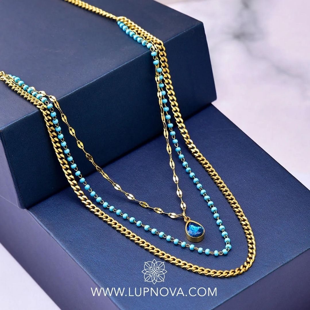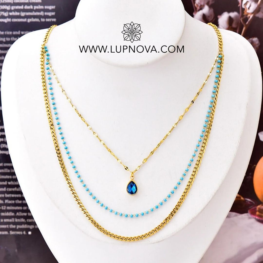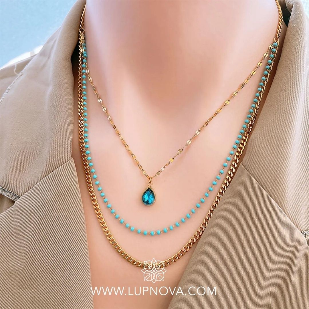 Cadena multi capa en color aqua. La cadena interna tiene un largo de 39 centímetros, la intermedia 44 centímetros y la externa 47 centímetros, más extensión de 5cm. Material acero inoxidable con baño de oro 18k. Las cadenas están juntas y no pueden usarse por separado.