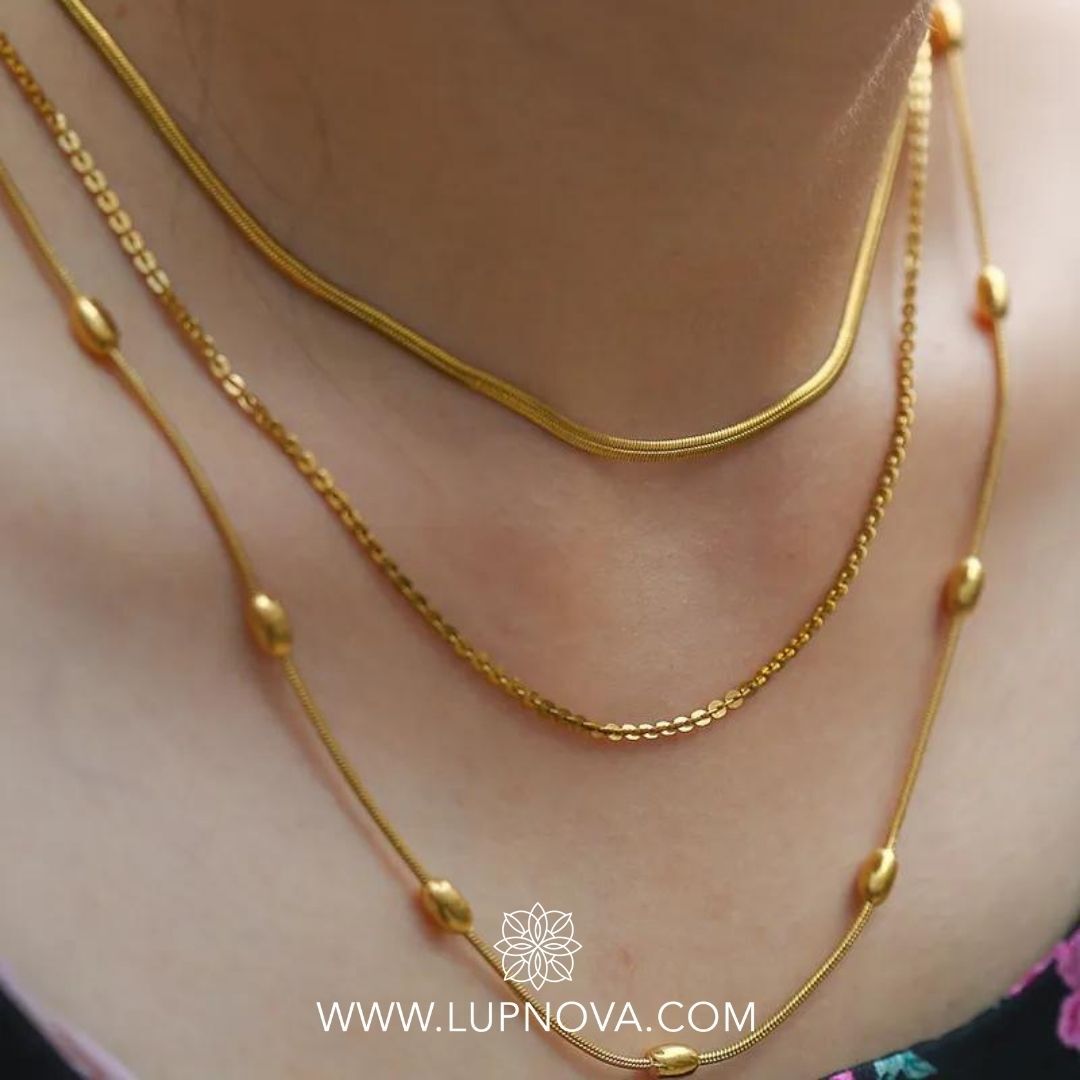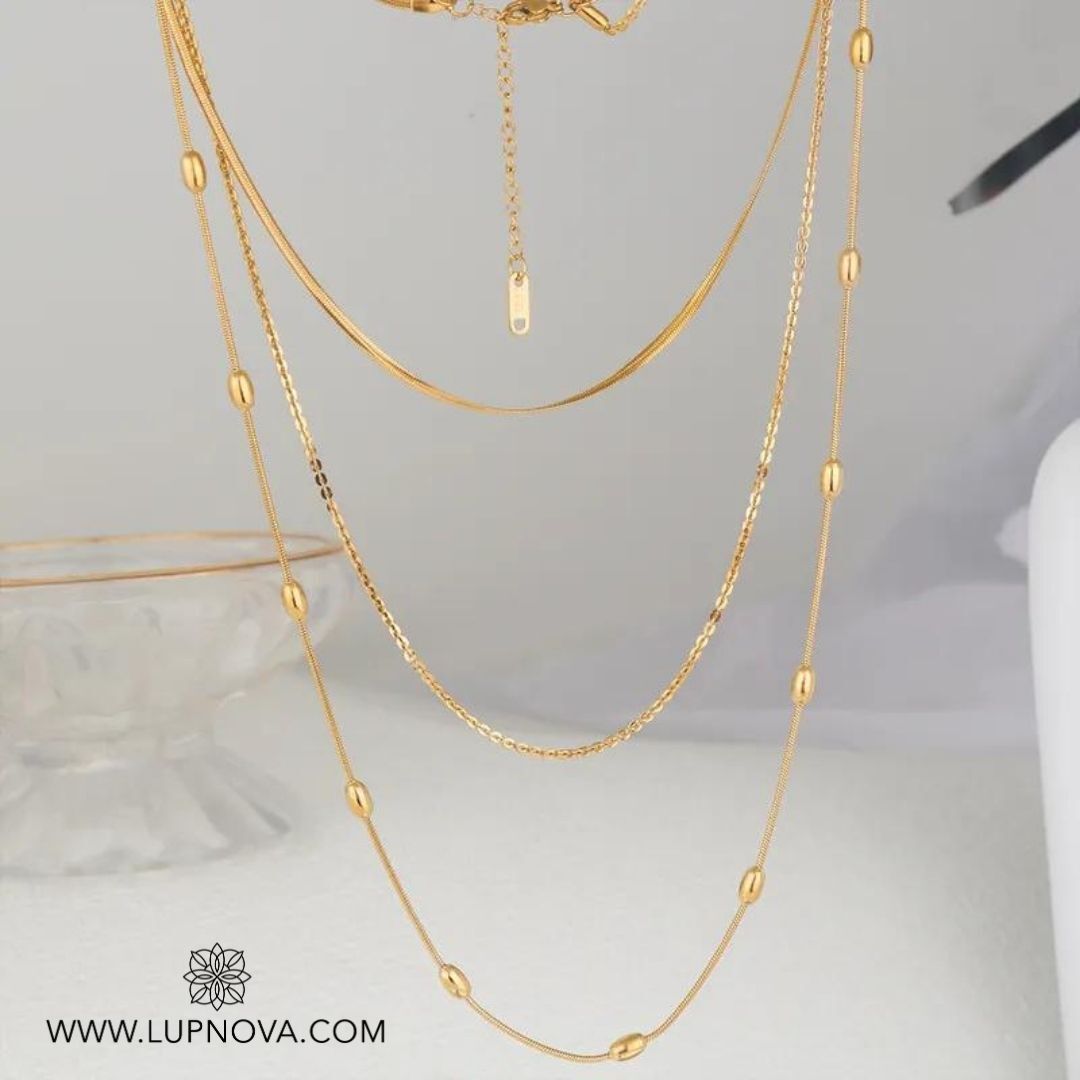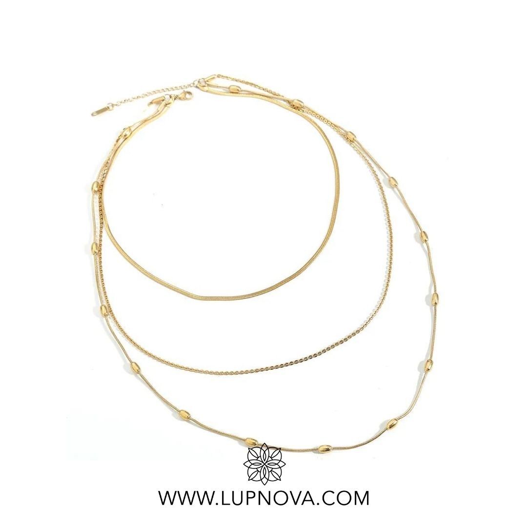 Cadena de tres capas. La cadena interna tiene un largo de 40cm, la cadena intermedia un largo de 50cm y la cadena externa un largo de 60cm, más extensión de 5cm. Las cadenas están unidas y no pueden usarse por separado.